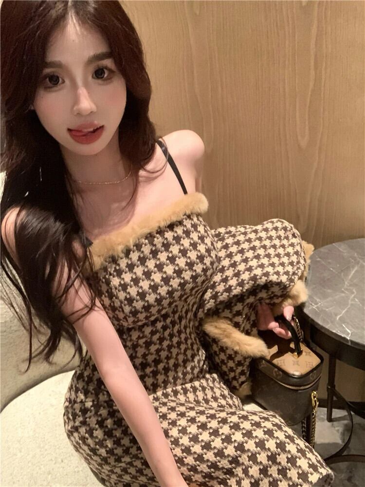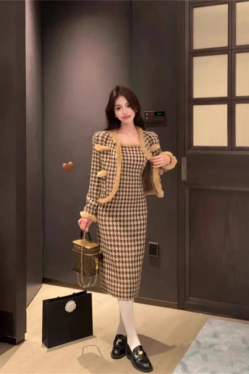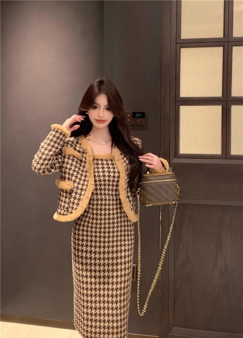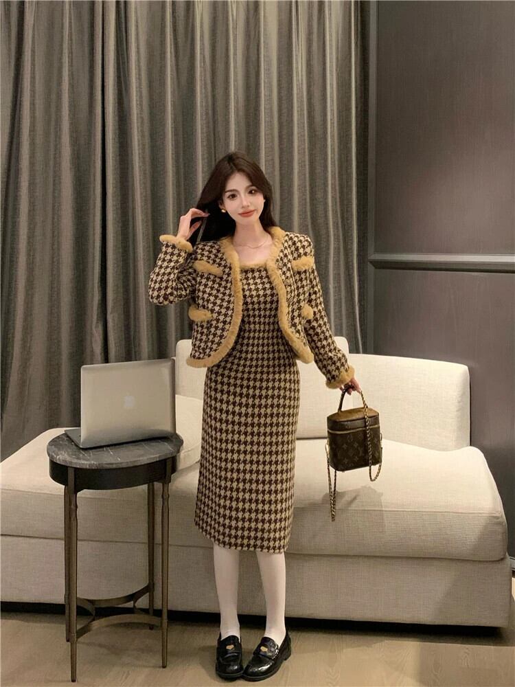 甘いホットガールスーツ秋と冬ツバメガードぬいぐるみショートジャケットストラップロングドレスツーピースセット 大人ガーリー スウィート キュート カジュアル オータム 秋物 ウィンター 冬物