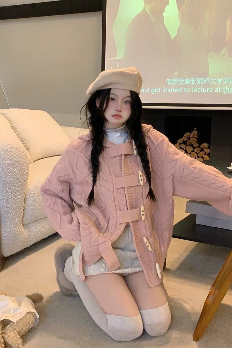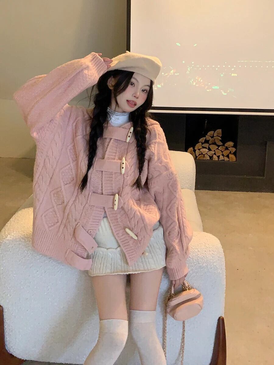 Sweet Girl Twists 長袖フード付きニットカーディガンコート秋と冬ルーズホーンボタンセーター ロング 大人ガーリー スウィート キュート カジュアル オータム 秋物 ウィンター 冬物