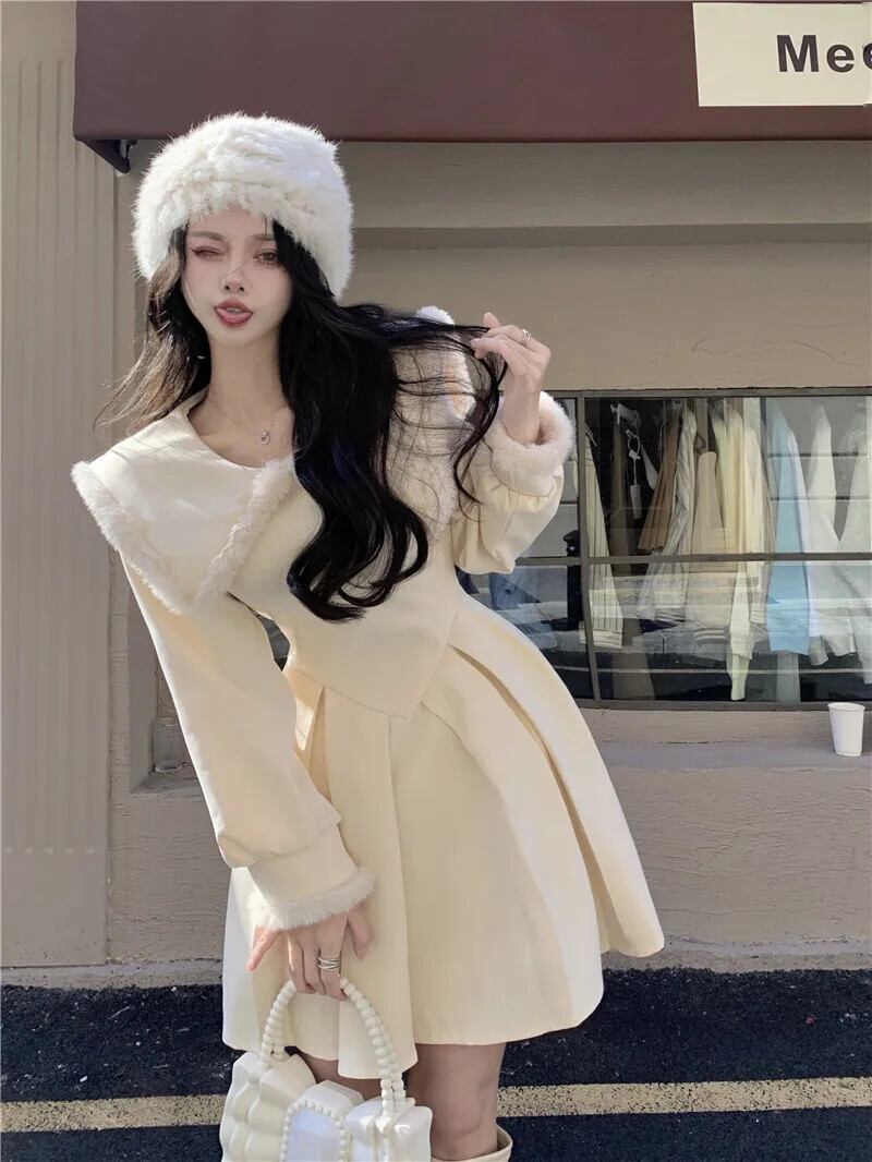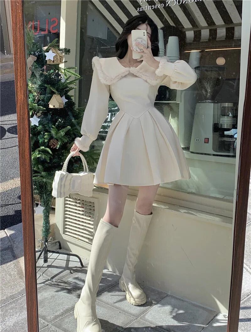 フレンチホットガール長袖プリーツドレス秋と冬ぬいぐるみと厚い毛皮襟ショートドレス ロング オータム 秋物 ウィンター 冬物