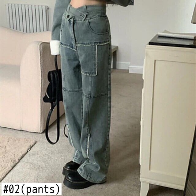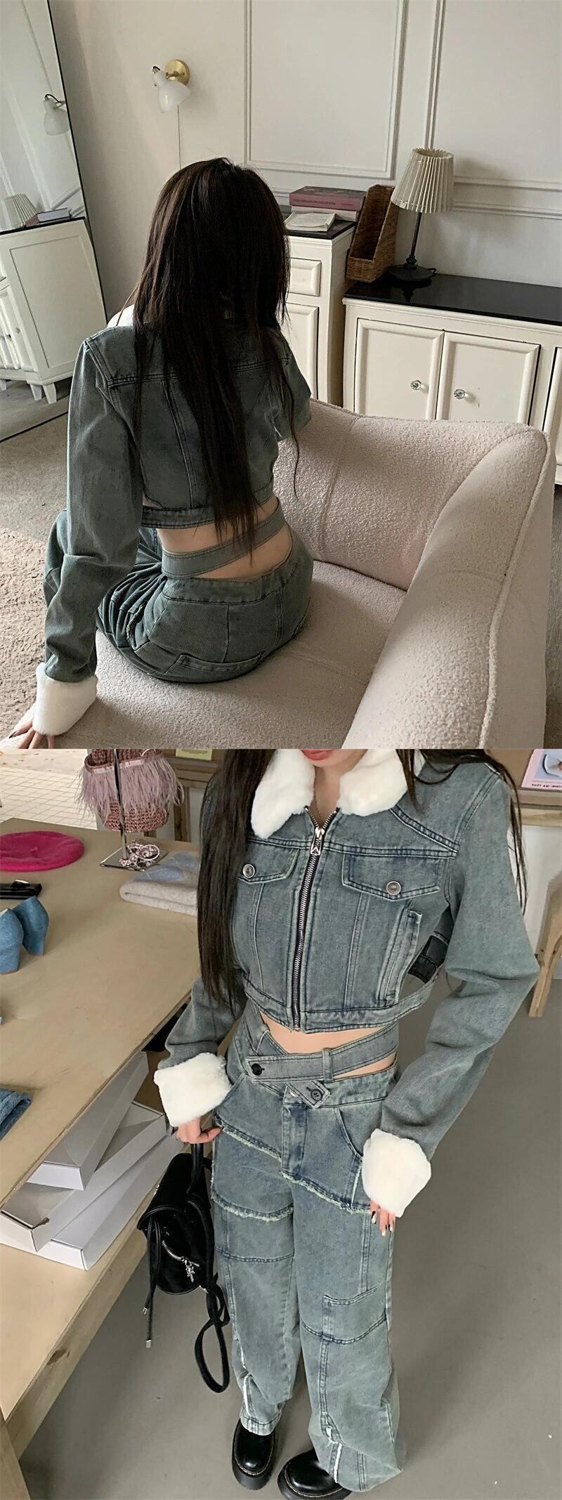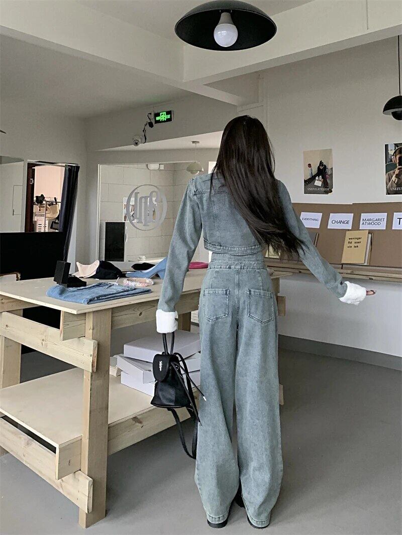 ホットガールアメリカンレトロスーツ冬毛皮襟ショート長袖デニムコートウエストワイド脚パンツ 2 点セット ロング ウィンター 冬物 ワイドレッグ ワイドパンツ