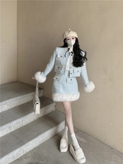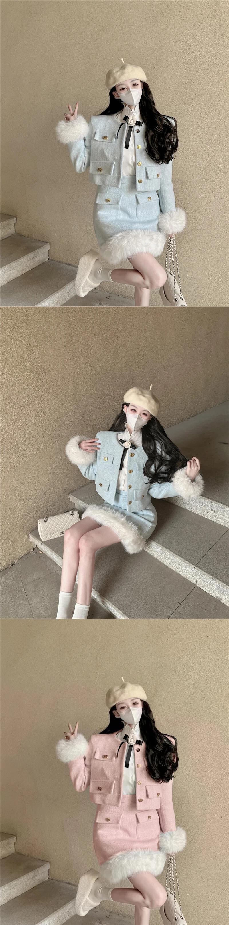フレンチスイートガールスーツ秋冬ウールOネック長袖コートショートスカートツーピースセット ロング 大人ガーリー スウィート キュート カジュアル オータム 秋物 ウィンター 冬物