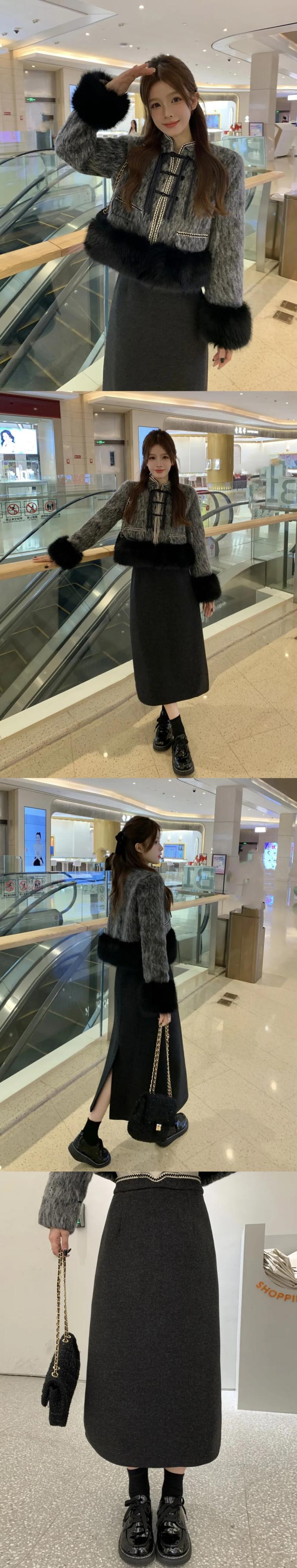 中国風レトロスーツ秋と冬バックルファーエッジコート A ラインロングスカート 2 点セット オータム 秋物 ウィンター 冬物 Aライン