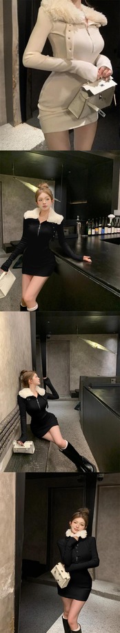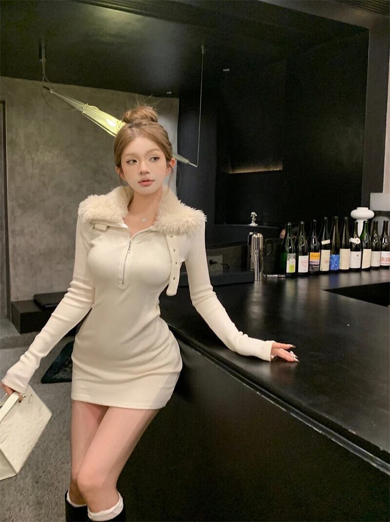 甘いホット女子毛皮襟スリムフィットドレス秋/冬 V ネックセクシーラップヒップニットドレス 大人ガーリー スウィート キュート カジュアル オータム 秋物 ウィンター 冬物 Vネック