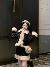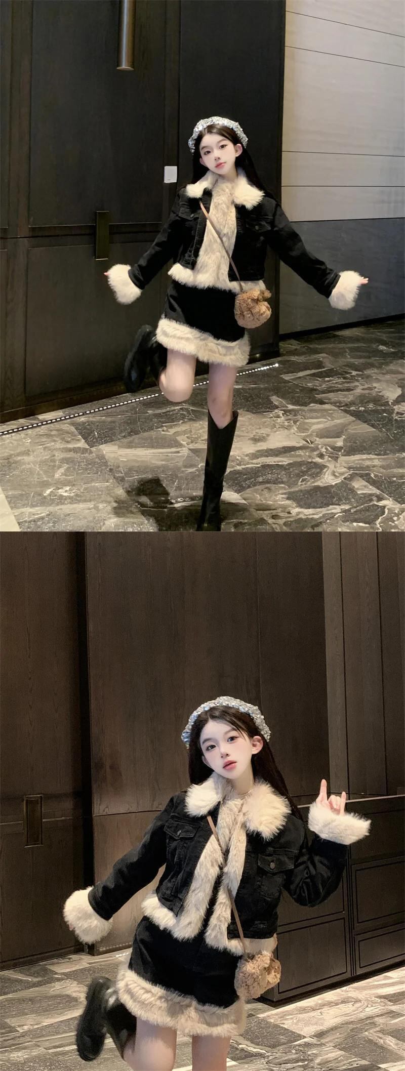 Sweet Girl スーツ レディース 秋冬 ファー襟 コントラスト デニム コットン ジャケット ウエスト Aライン ミニスカート 2点セット 大人ガーリー スウィート キュート カジュアル オータム 秋物 ウィンター 冬物