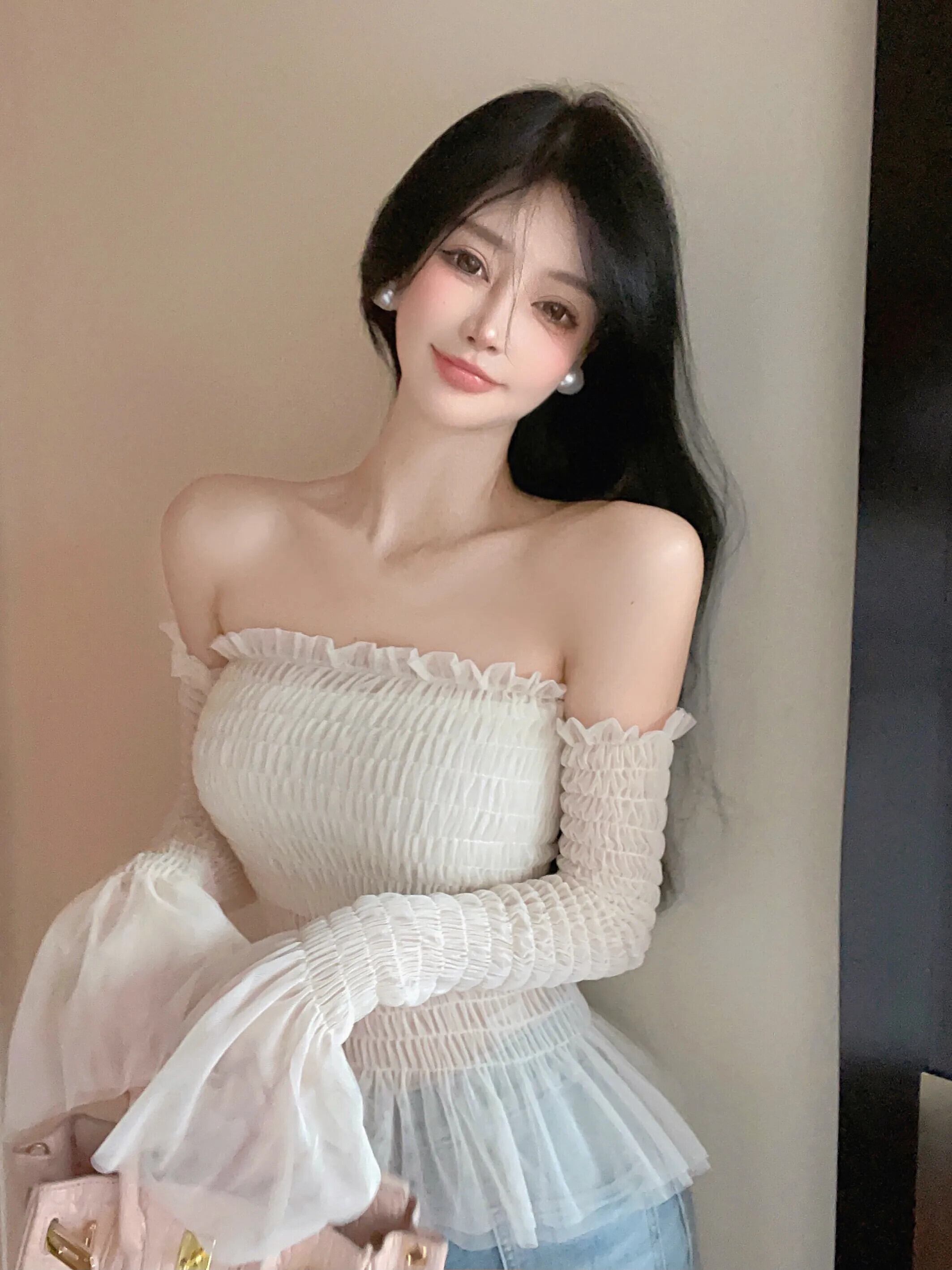 フランス純粋セクシーホットガールスラッシュネックフリルレースシャツ秋フィット長袖ショート Tシャツ ロング オータム 秋物 ピュア
