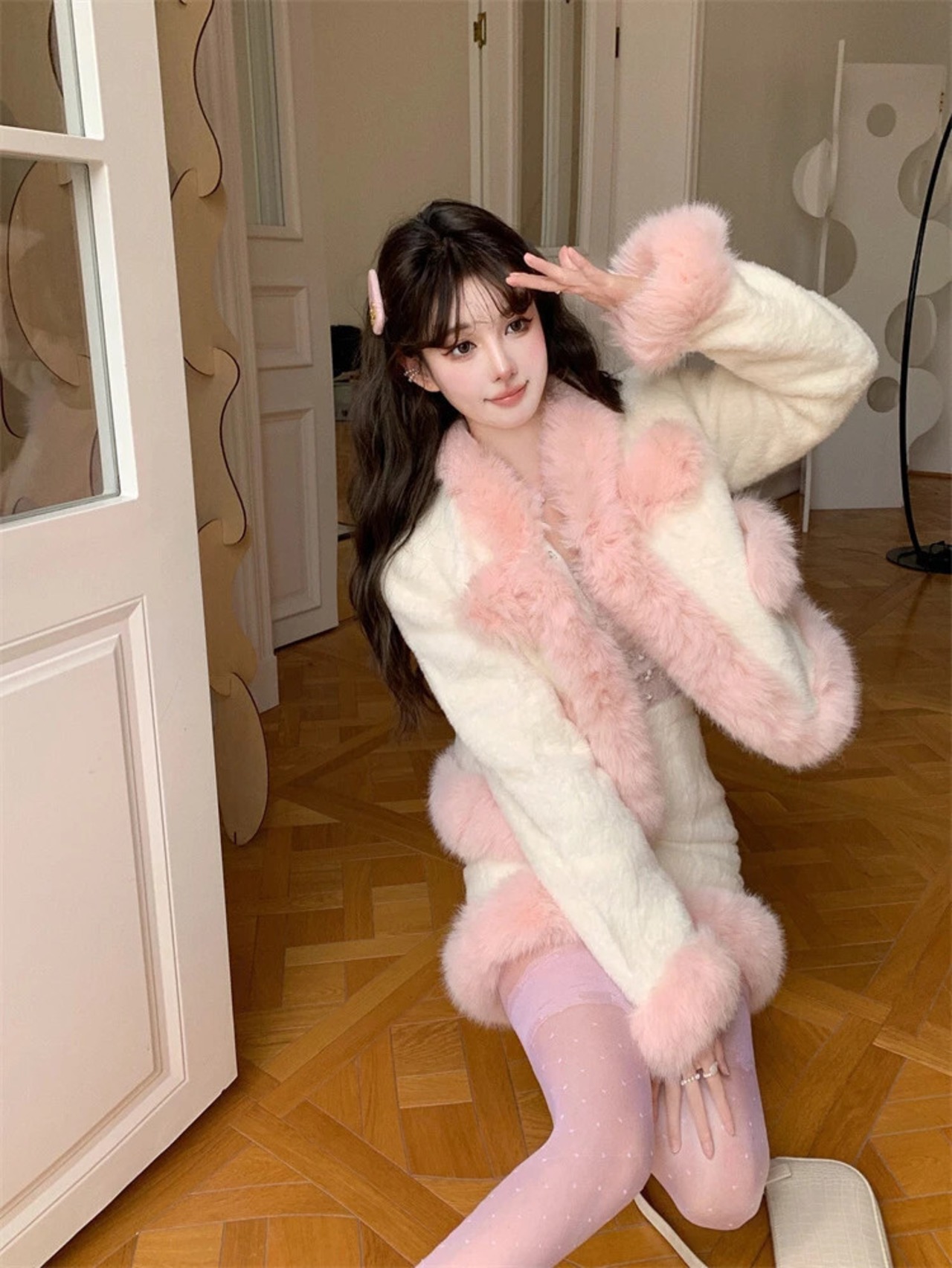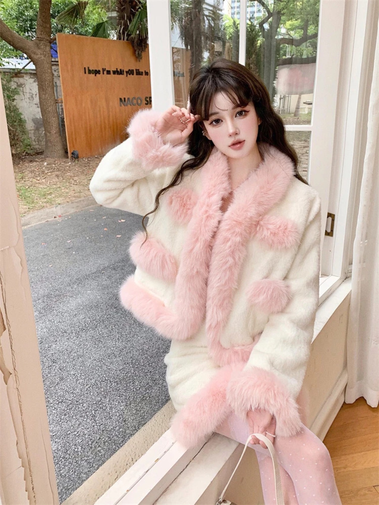 フレンチスタイル甘いホットガールスーツ冬毛皮コートコットンカーディガンミニスカートツーピースセット 大人ガーリー スウィート キュート カジュアル ウィンター 冬物