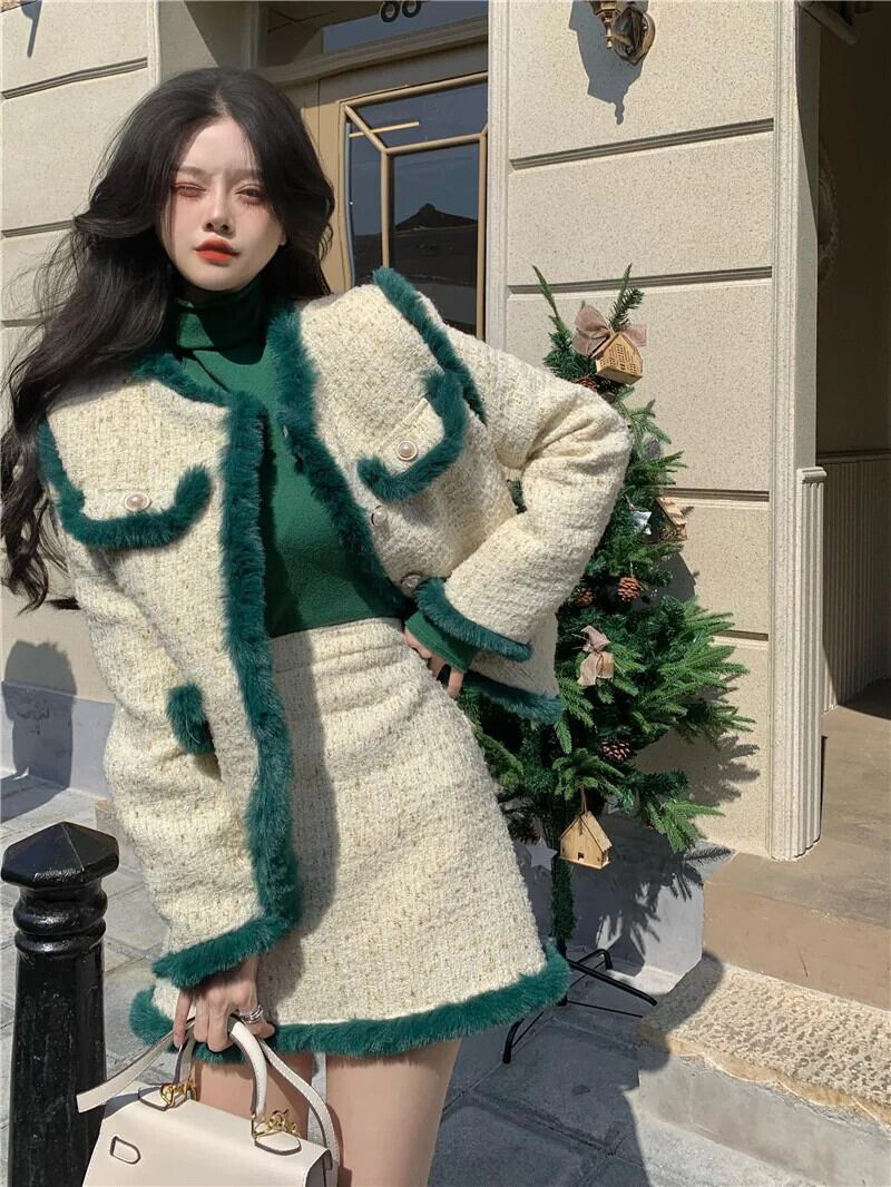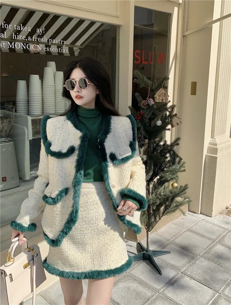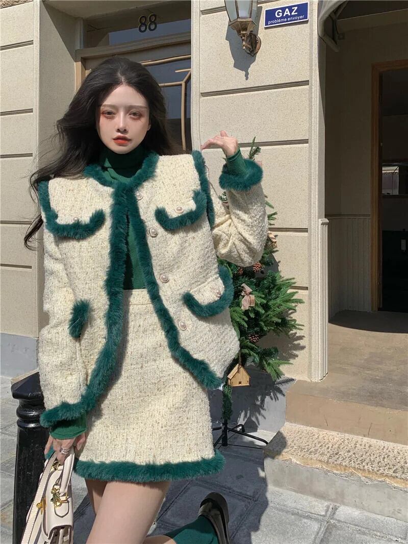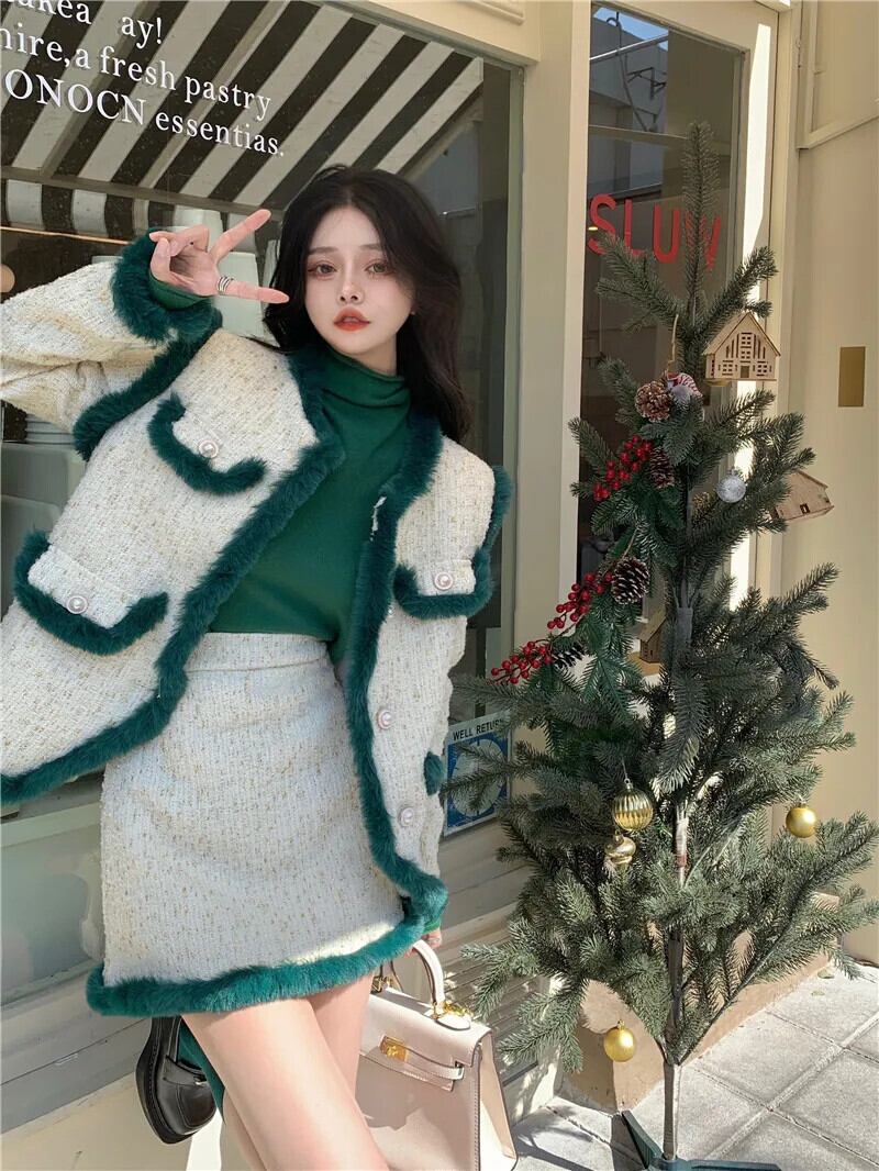 フレンチホットガールレトロスーツ冬豪華ツイード長袖ショートコートウエストミニスカートツーピースセット ロング ウィンター 冬物
