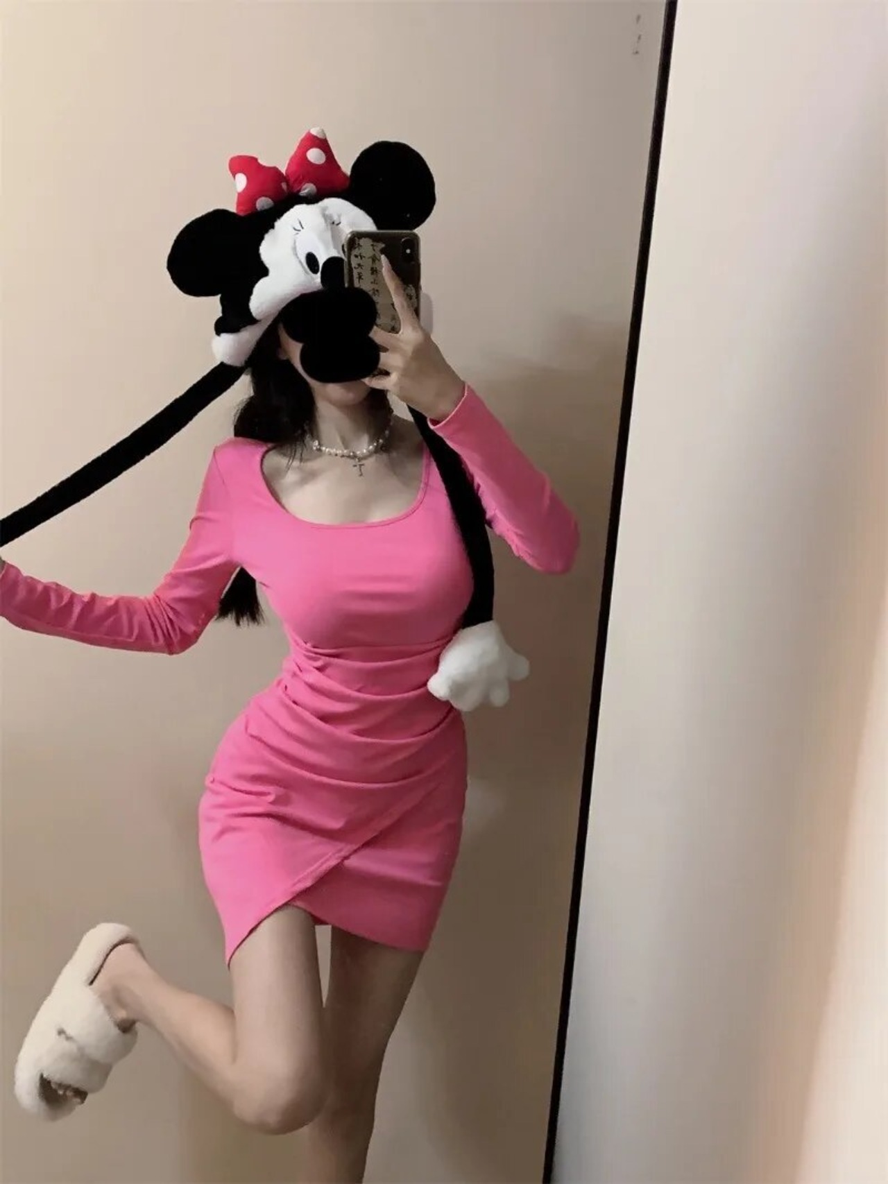 ホットガールセクシーソリッドスクエアカラープリーツドレス秋スリム長袖ラップヒップショートドレス ロング オータム 秋物 ソリッドカラー スクウェア