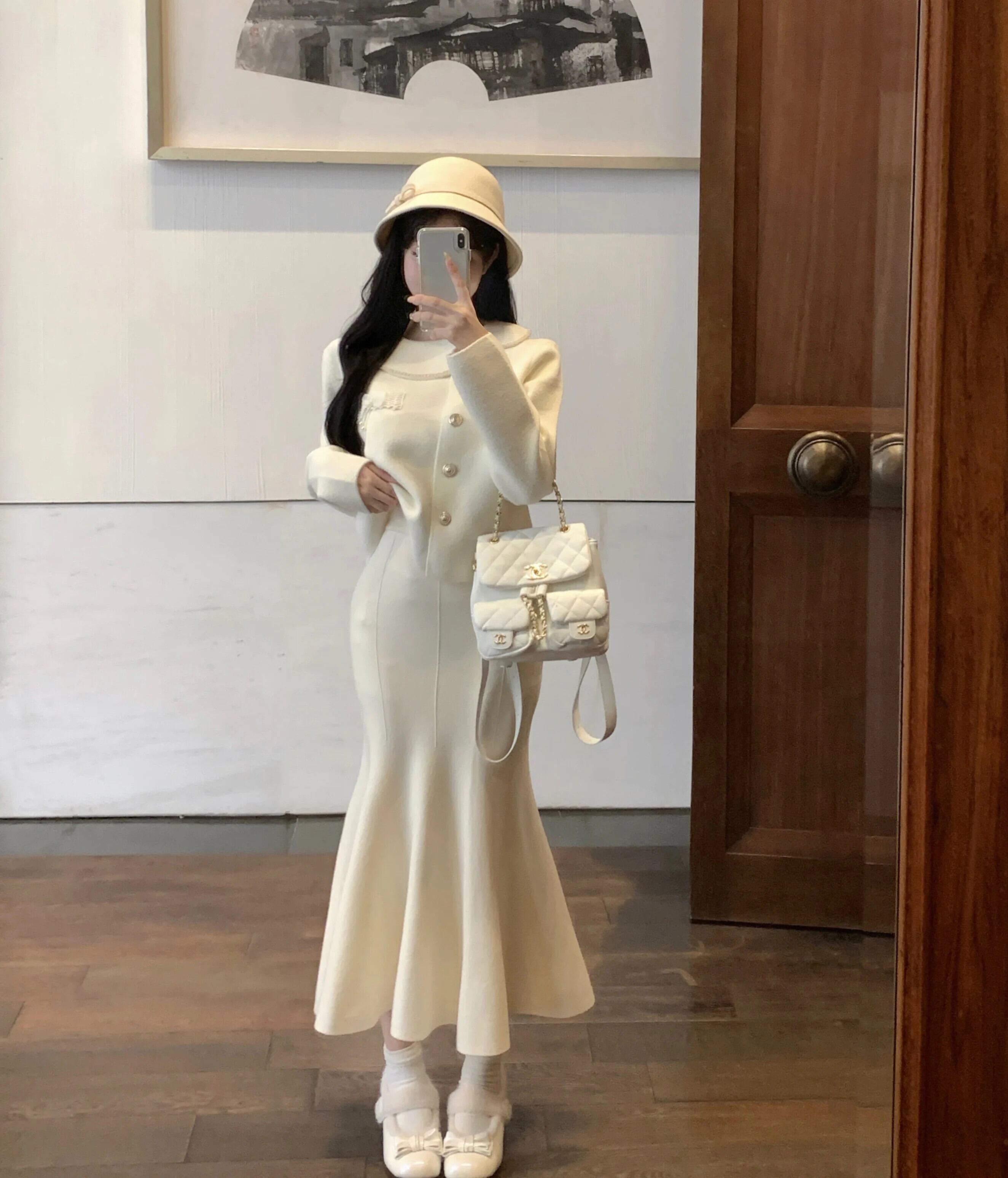 スイートガールスーツ秋/冬長袖ニットシングルブレストコートロングマーメイドスカートツーピースセット 大人ガーリー スウィート キュート カジュアル オータム 秋物 ウィンター 冬物