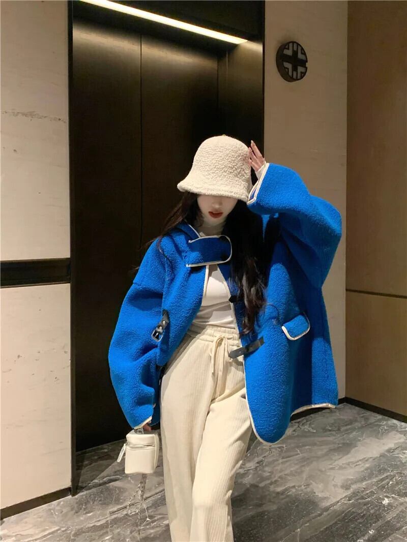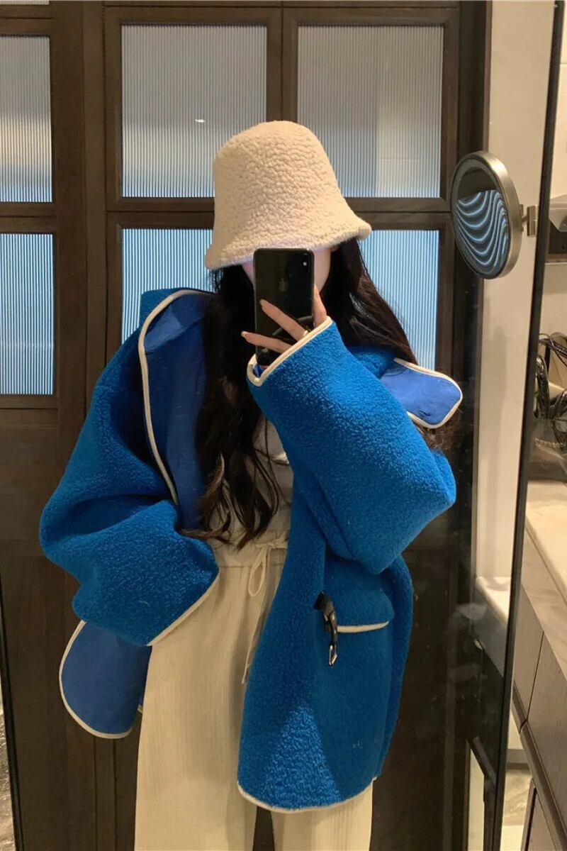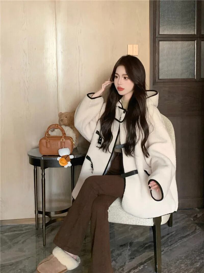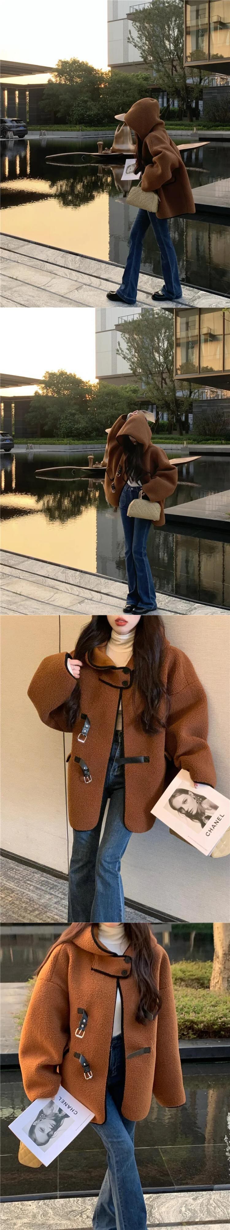 ルーズフード付きラムウールコート秋と冬豪華シングルブレストミディアム丈コート オータム 秋物 ウィンター 冬物