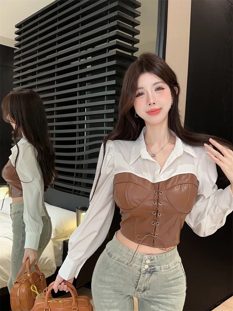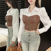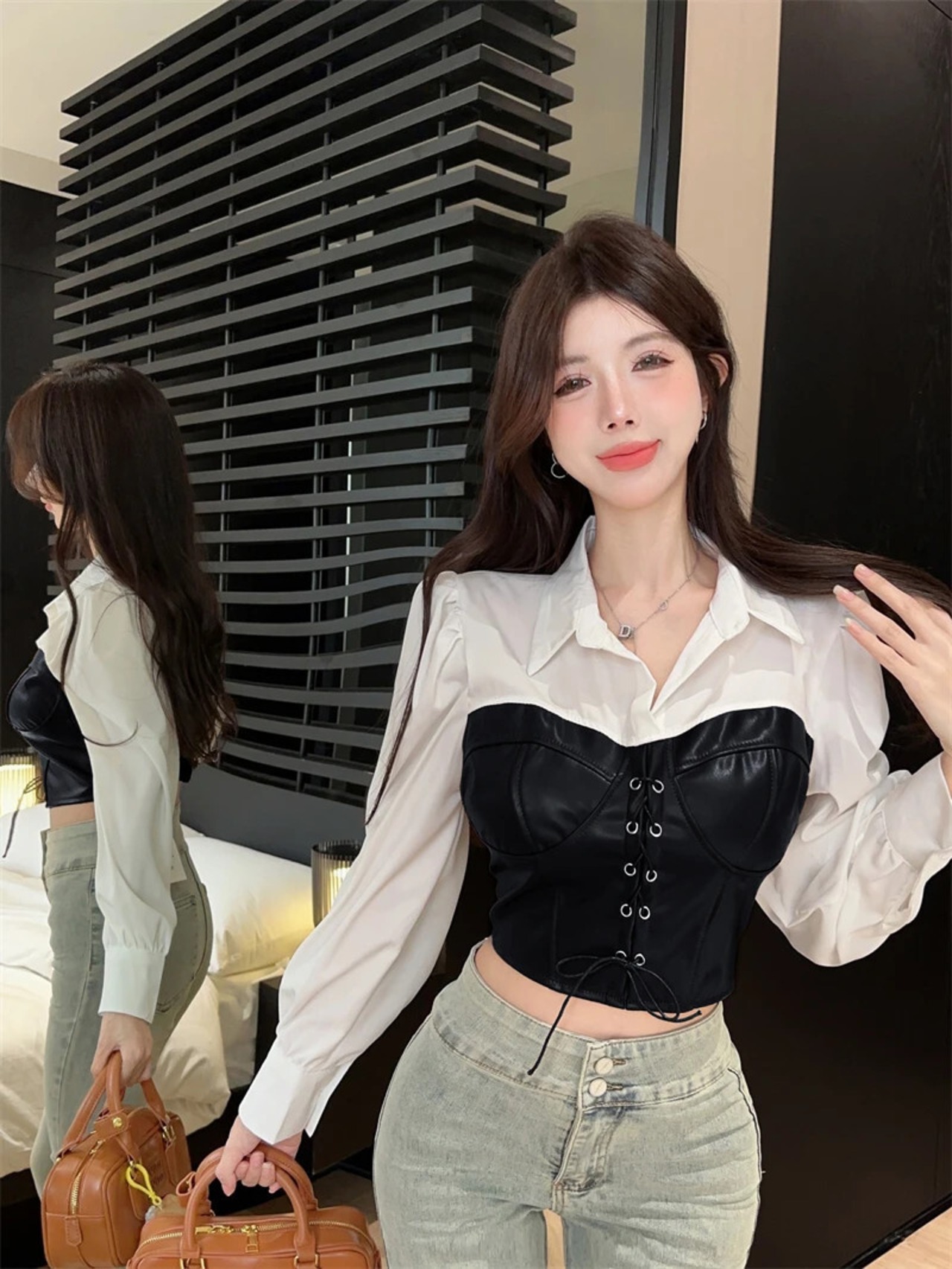 ポロネックパネルレザースリムフィットシャツ秋不規則多用途バブルスリーブレースアップセクシーシャツ オータム 秋物 Oネック