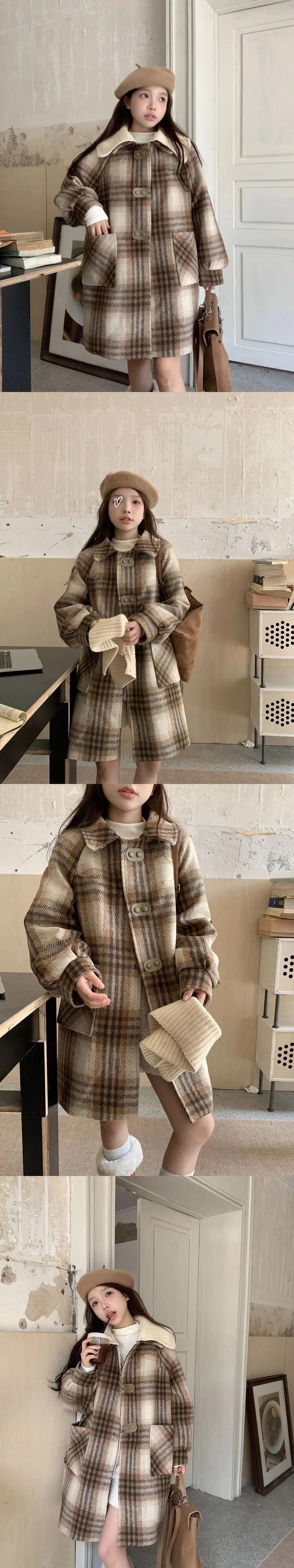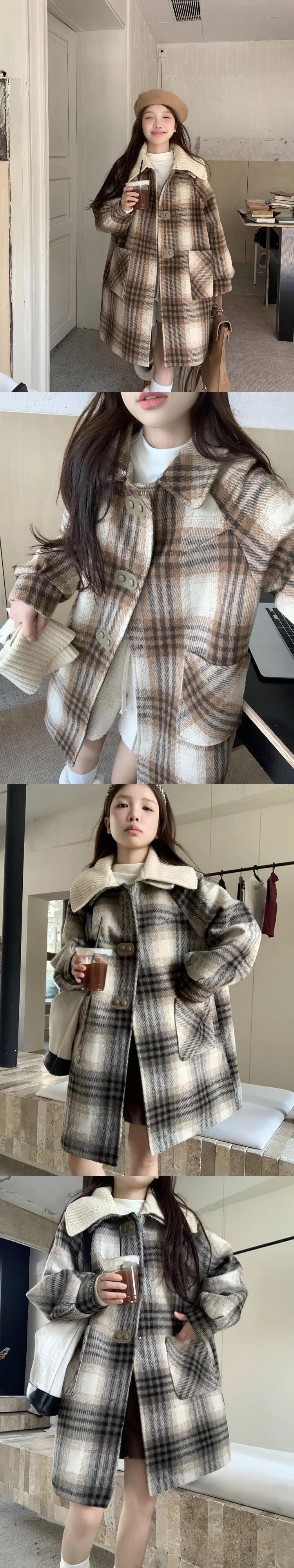 メイラードスタイルスウィートガール取り外し可能襟チェック柄ウールコート秋と冬ルーズで厚みあるミドル丈コート 大人ガーリー キュート カジュアル オータム 秋物 ウィンター 冬物