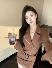 ホットガールメイラードスタイルスエードターンダウンカラードレス秋/冬ブラウンスリムフィットラップヒップショートドレス スウェード オータム 秋物 ウィンター 冬物