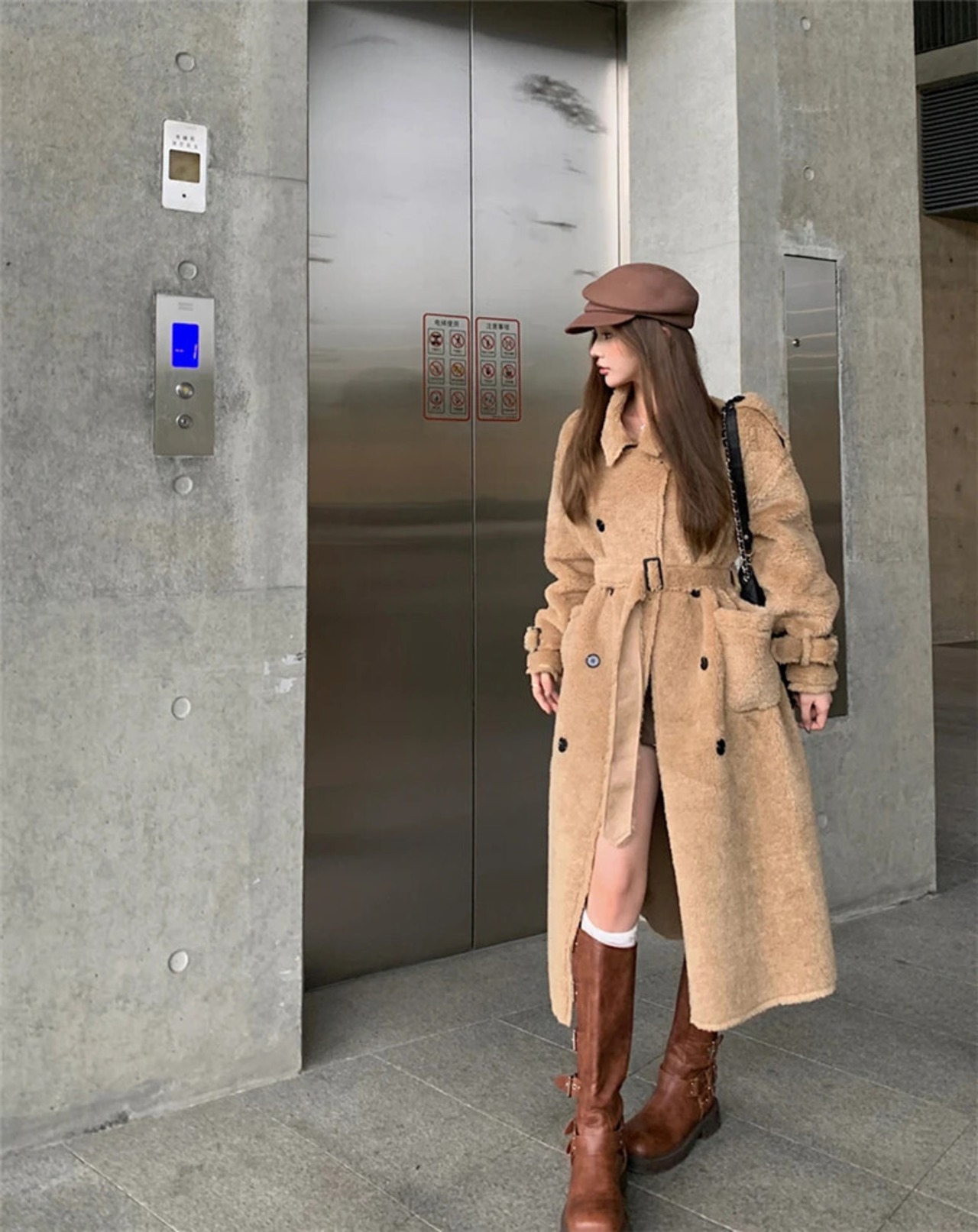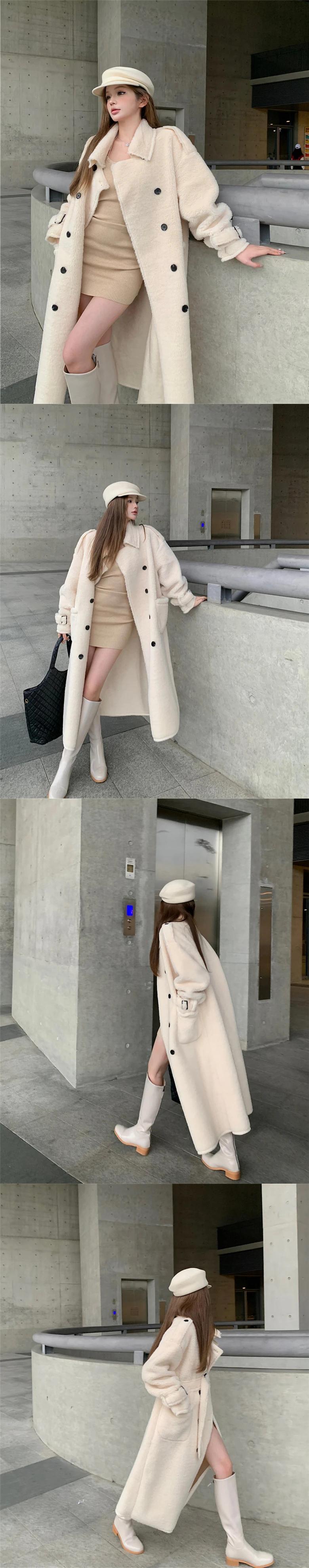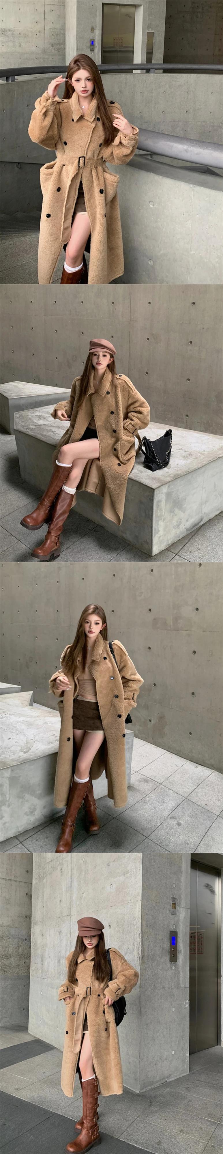 ホットガールミッドレングスターンダウン襟ラムウールコート冬肥厚ルーズレースアップ豪華コート ウィンター 冬物