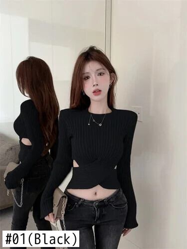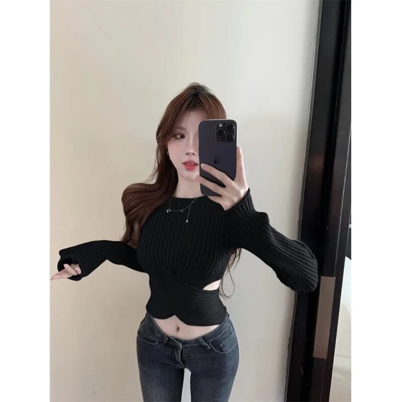 アメリカンホットガールズ不規則クロスセーター秋 O ネックスリムフィットショートニットプルオーバー オータム 秋物 Oネック