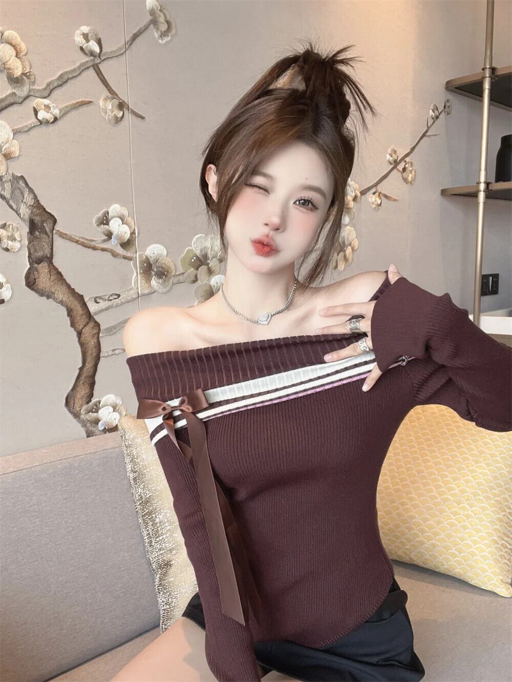 甘いホットガールコントラストスラッシュネック長袖セーター秋/冬スリムフィットニットプルオーバー ロング 大人ガーリー スウィート キュート カジュアル オータム 秋物 ウィンター 冬物