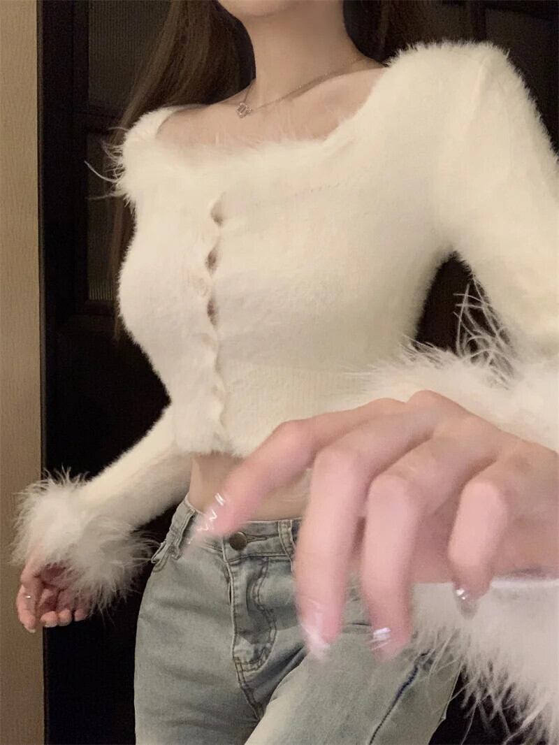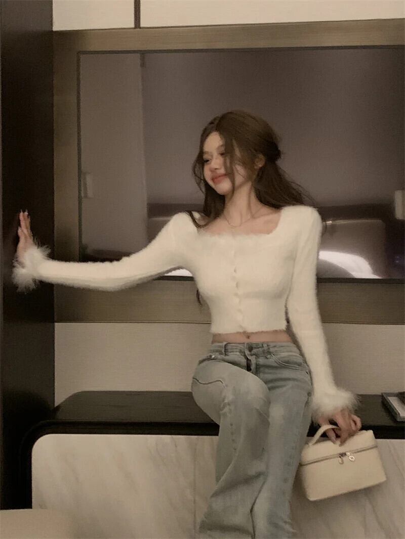 スウィートガールモヘア長袖ニットカーディガン秋と冬スリムフィットスクエアカラーショートセーター ロング 大人ガーリー キュート カジュアル オータム 秋物 ウィンター 冬物 スクウェア