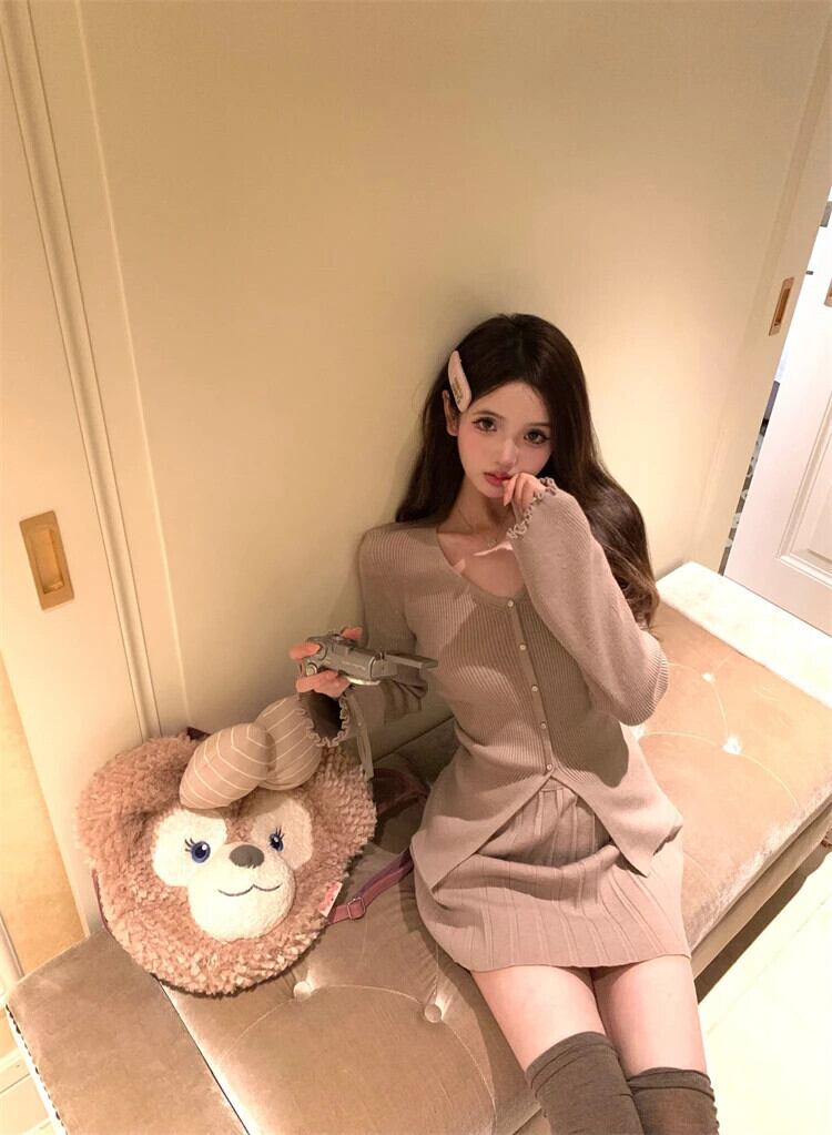 ホットガールソリッドカラースーツ秋 V ネックスリムフィット長袖ニットカーディガンプリーツミニスカート 2 点セット ロング オータム 秋物 Vネック