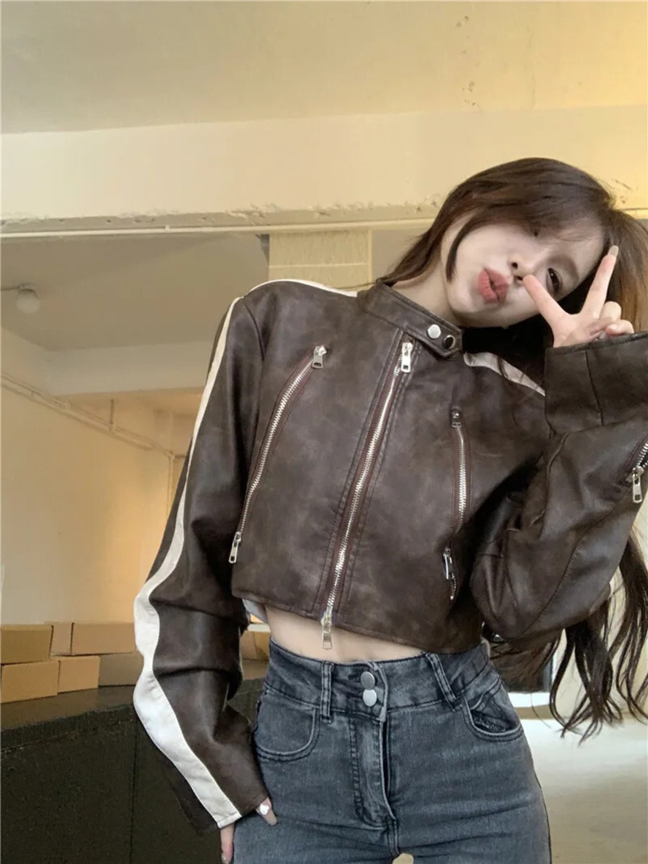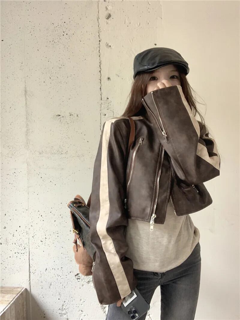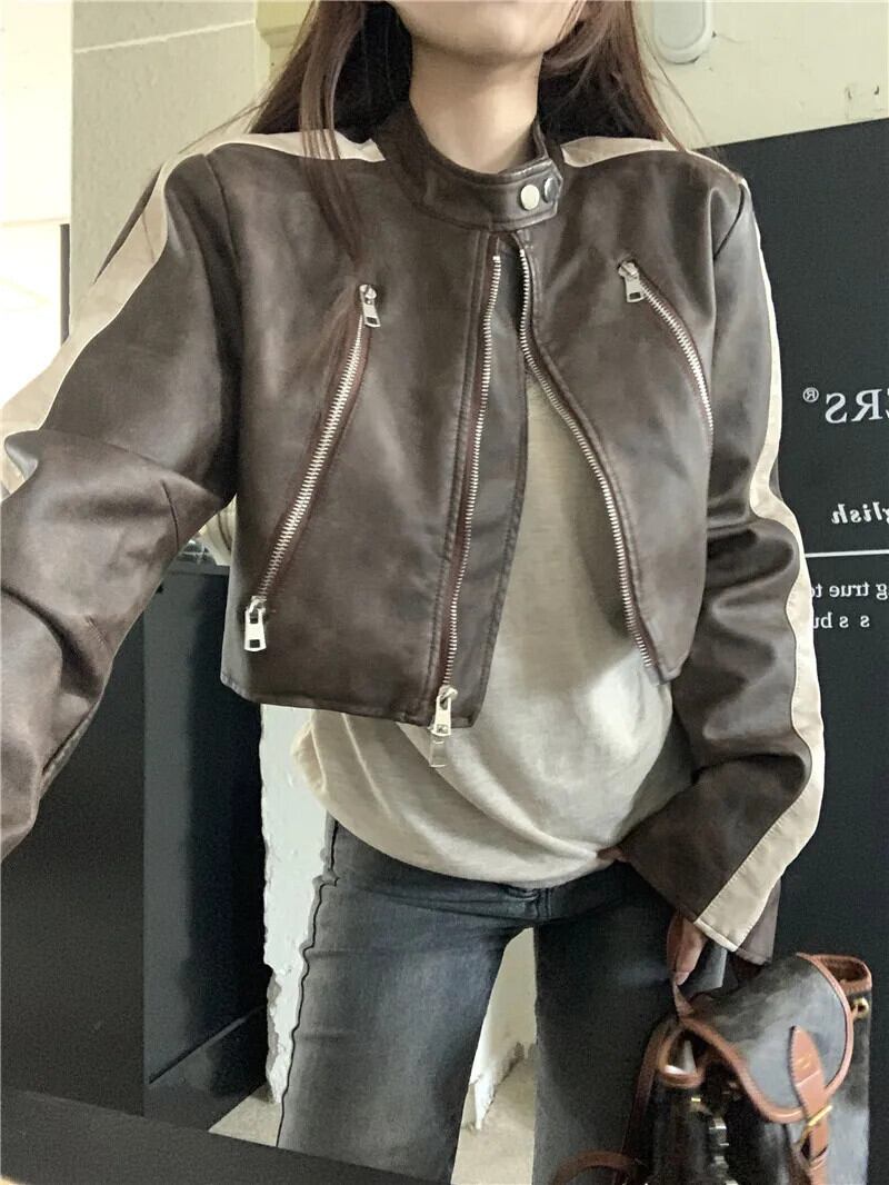 アメリカンホットガールスタンドカラー長袖コントラストレザーコート秋ジッパーショートジャケットトップ ロング オータム 秋物