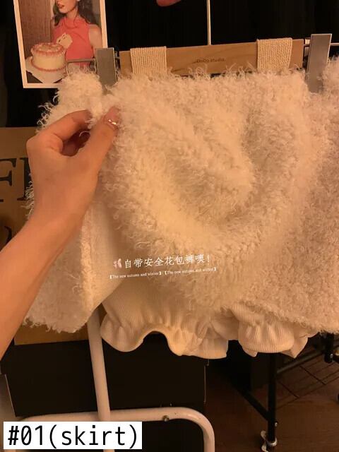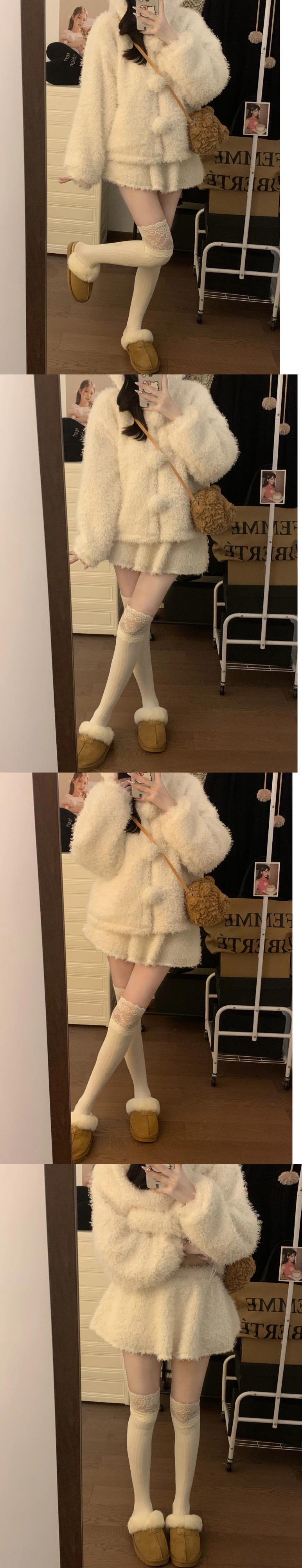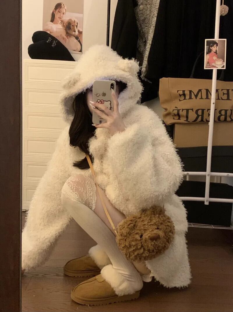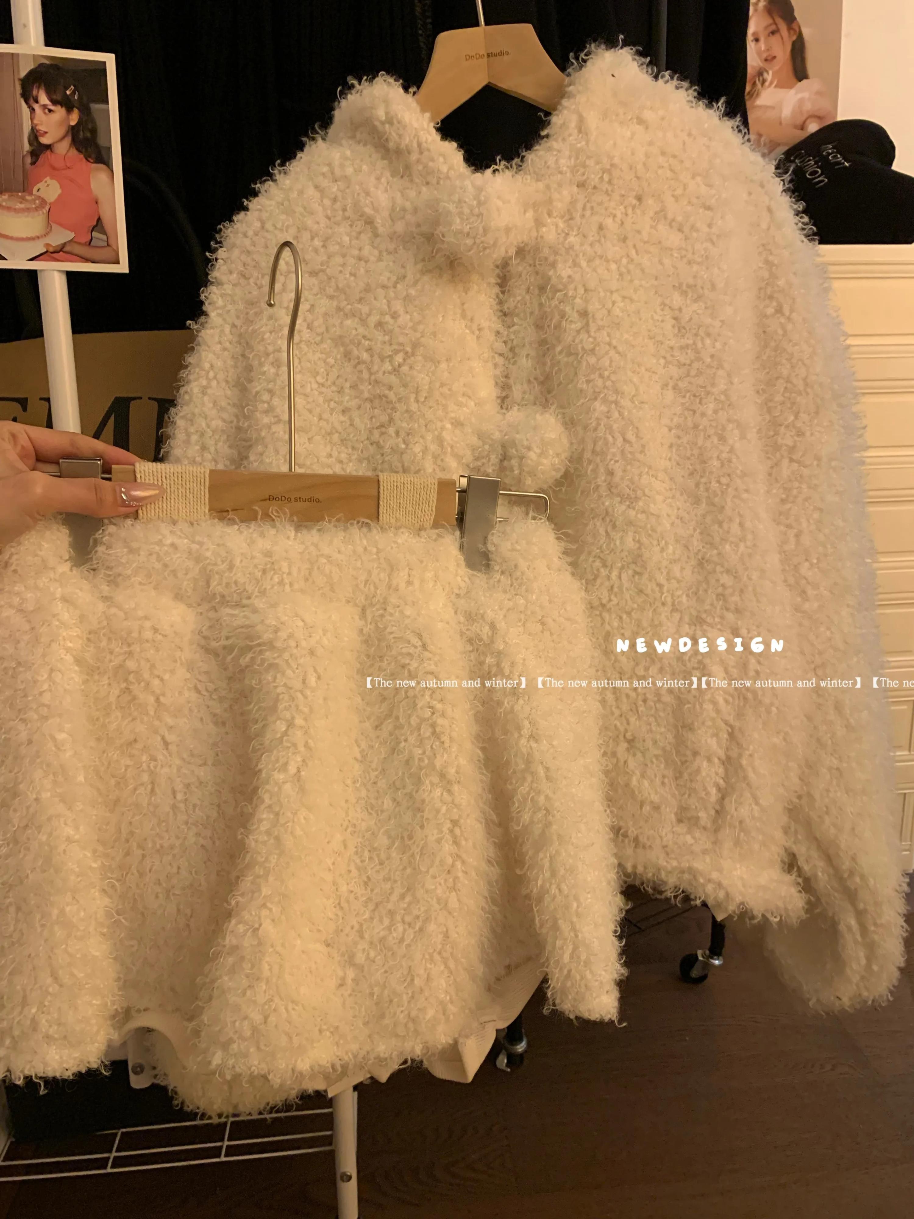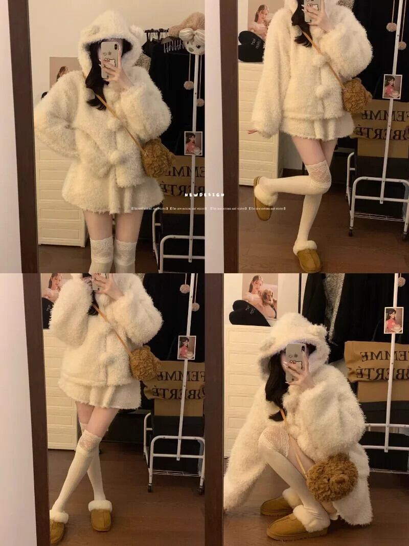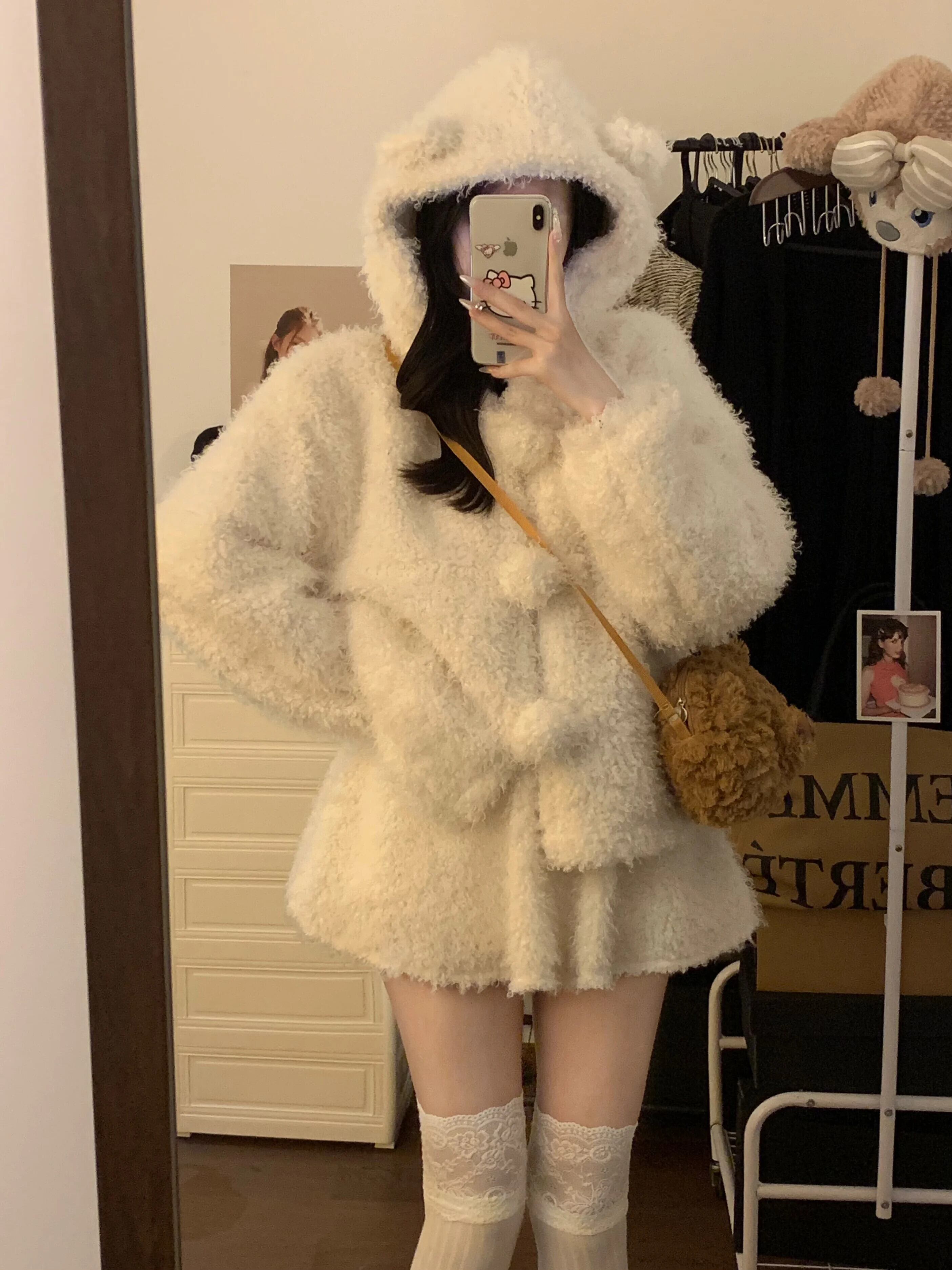 スウィートガールぬいぐるみスーツ冬クマ耳フード付きラムウールコートウエスト A ラインショートスカート 2 点セット 大人ガーリー キュート カジュアル ウィンター 冬物 Aライン