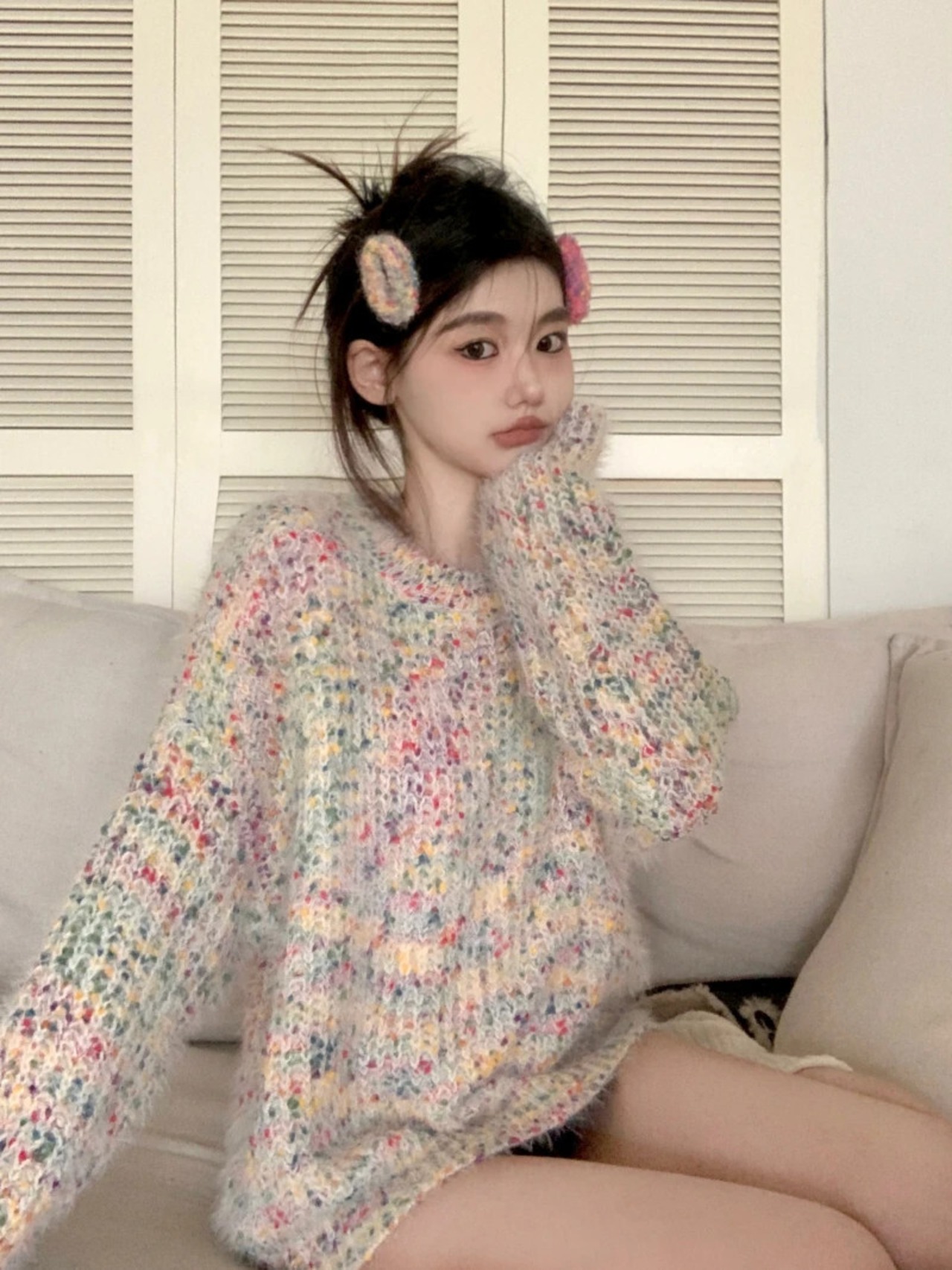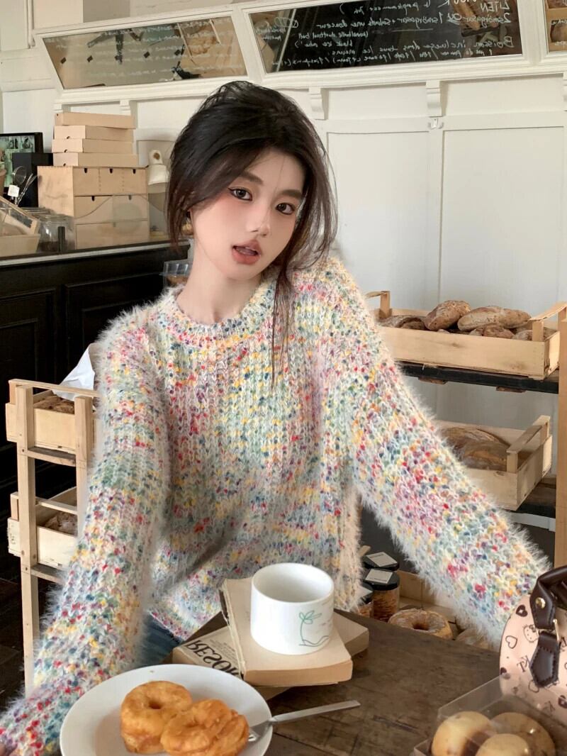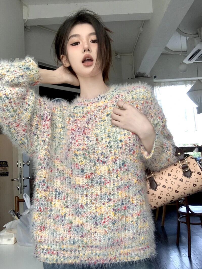 甘いホットガールカラフル点線モヘアセーター秋/冬ルーズ肥厚ニットプルオーバー 大人ガーリー スウィート キュート カジュアル オータム 秋物 ウィンター 冬物