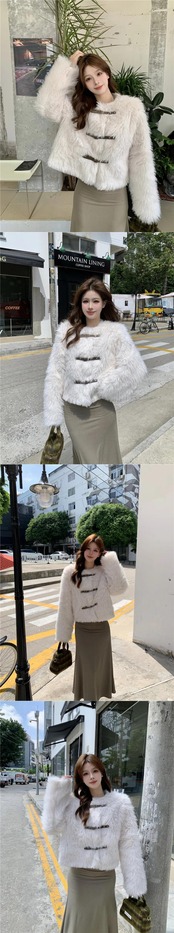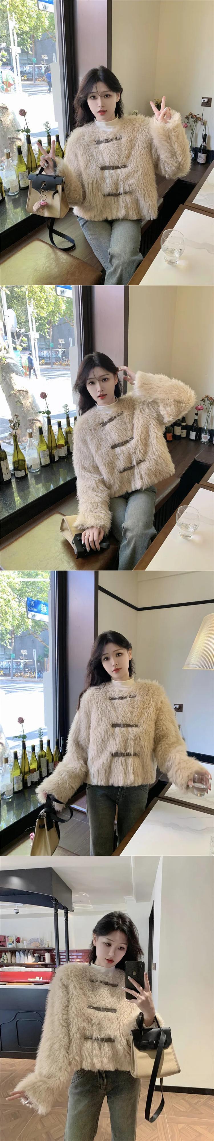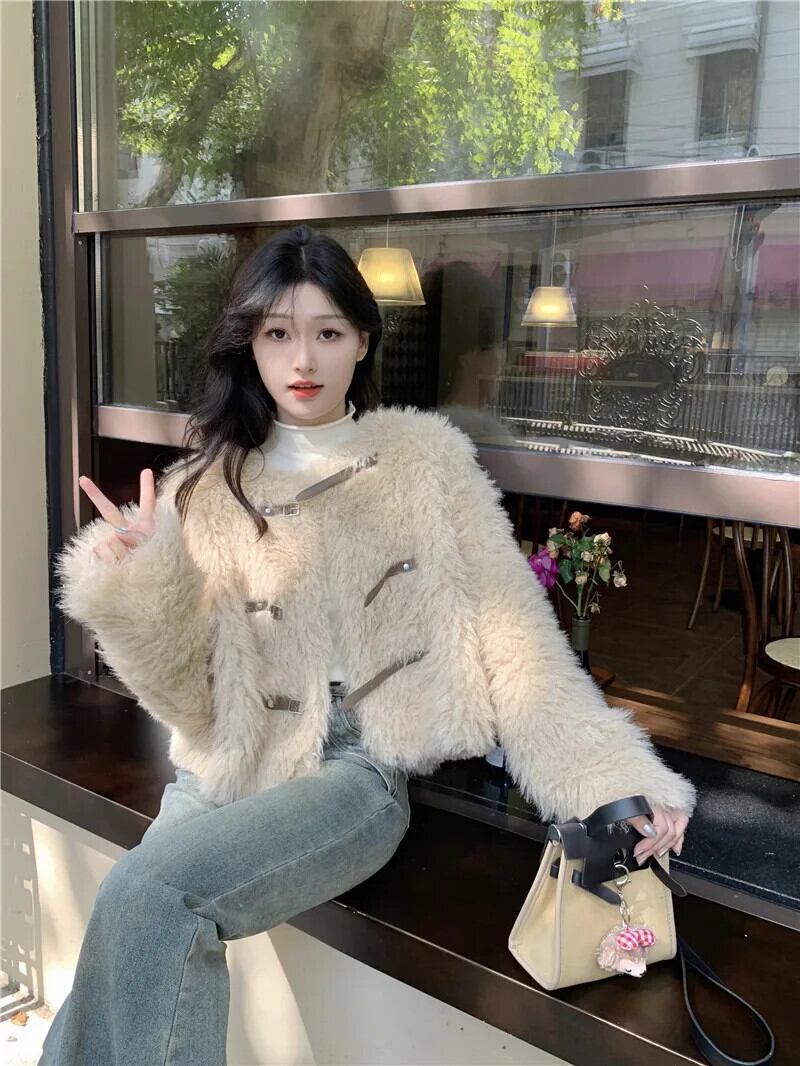 甘いホットガールフェイクファーカーディガンジャケット秋と冬ラウンドネックルーズで暖かいコート 大人ガーリー スウィート キュート カジュアル オータム 秋物 ウィンター 冬物 Oネック