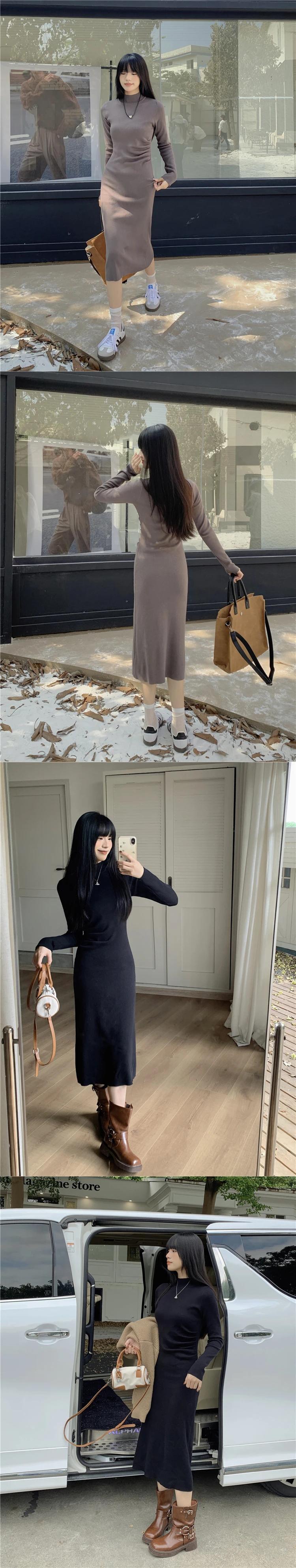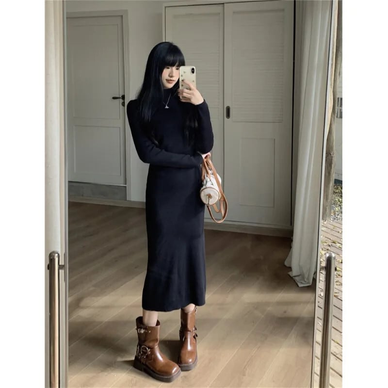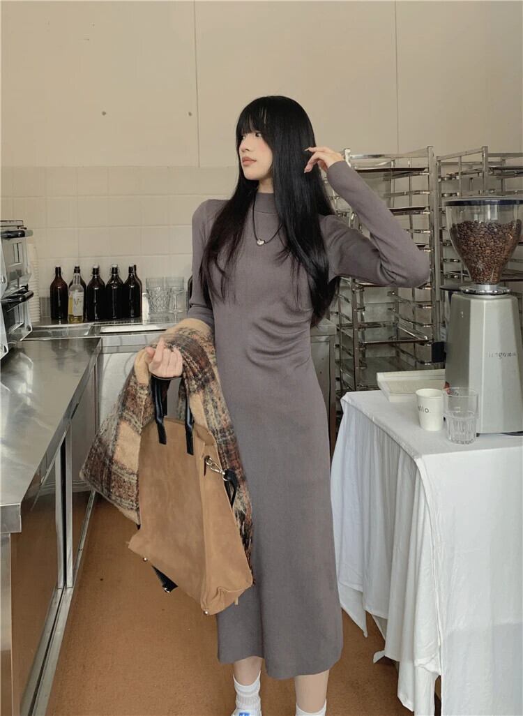 甘いホットガールソリッドプリーツハーフネックドレス秋/冬スリムフィットラップヒップロングドレス 大人ガーリー スウィート キュート カジュアル オータム 秋物 ウィンター 冬物 ソリッドカラー