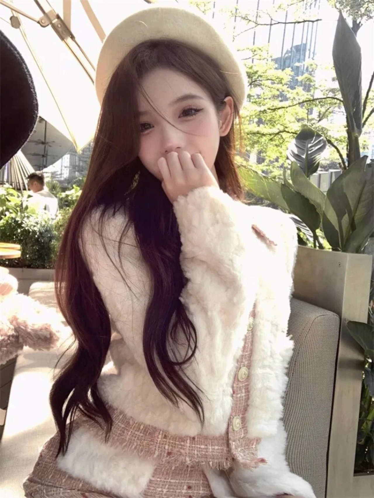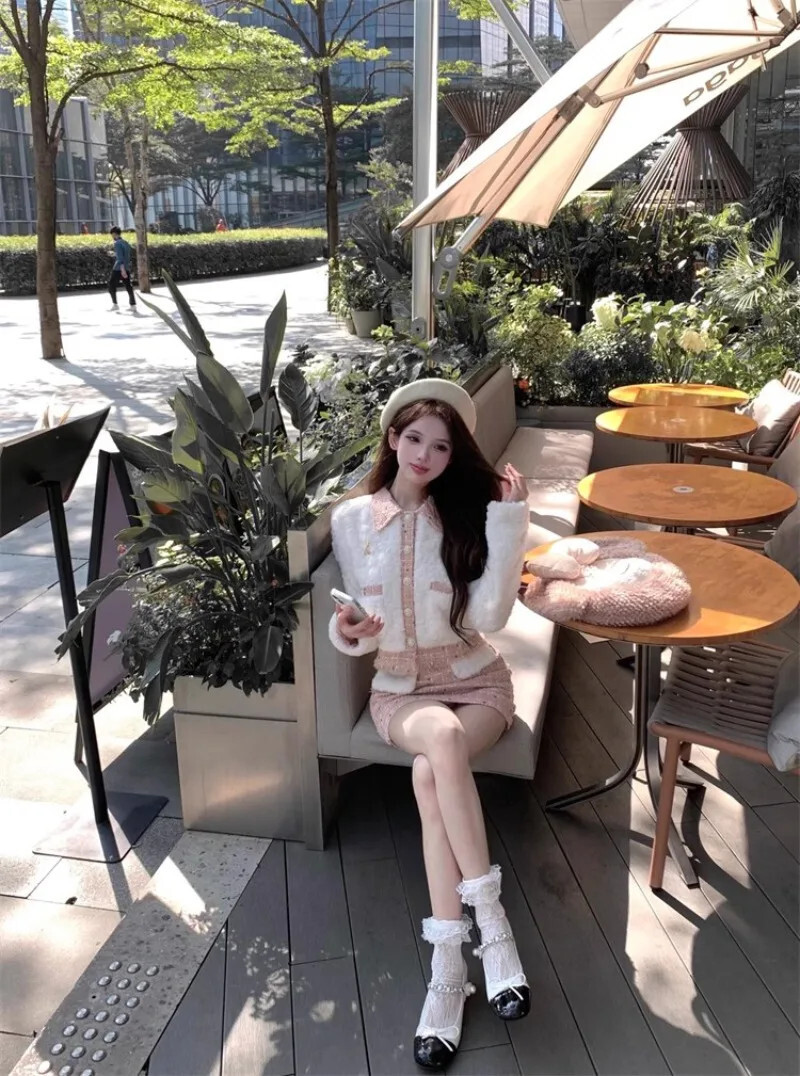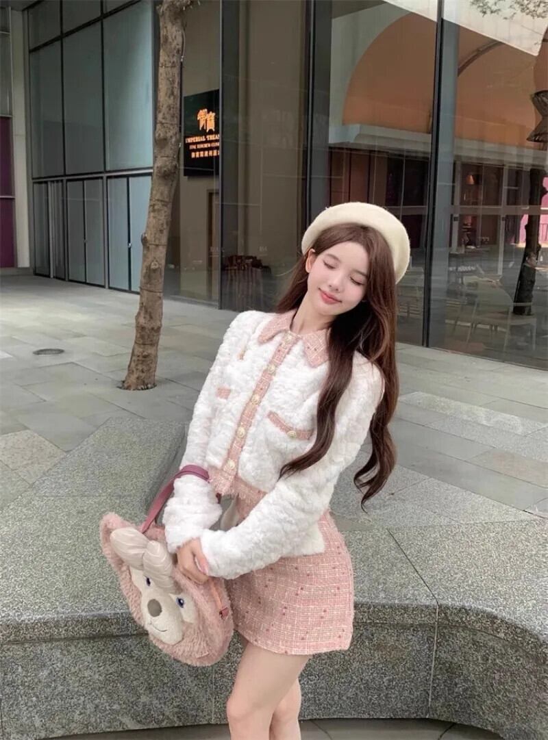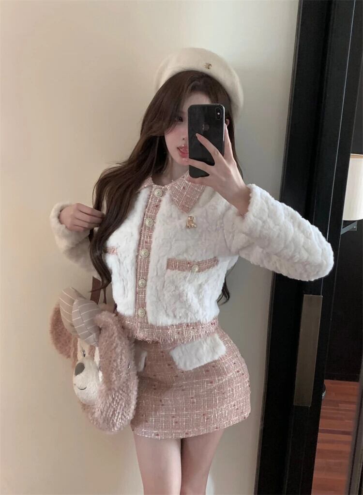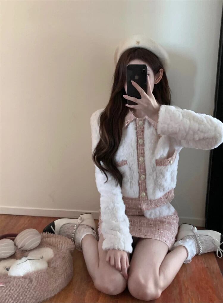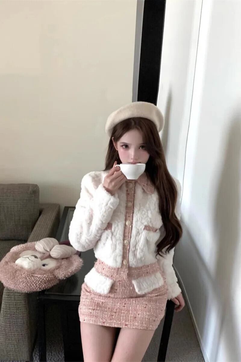 スイートガールスーツ秋/冬ラムぬいぐるみパネルショートコートラップヒップショートスカートツーピースセット 大人ガーリー スウィート キュート カジュアル オータム 秋物 ウィンター 冬物
