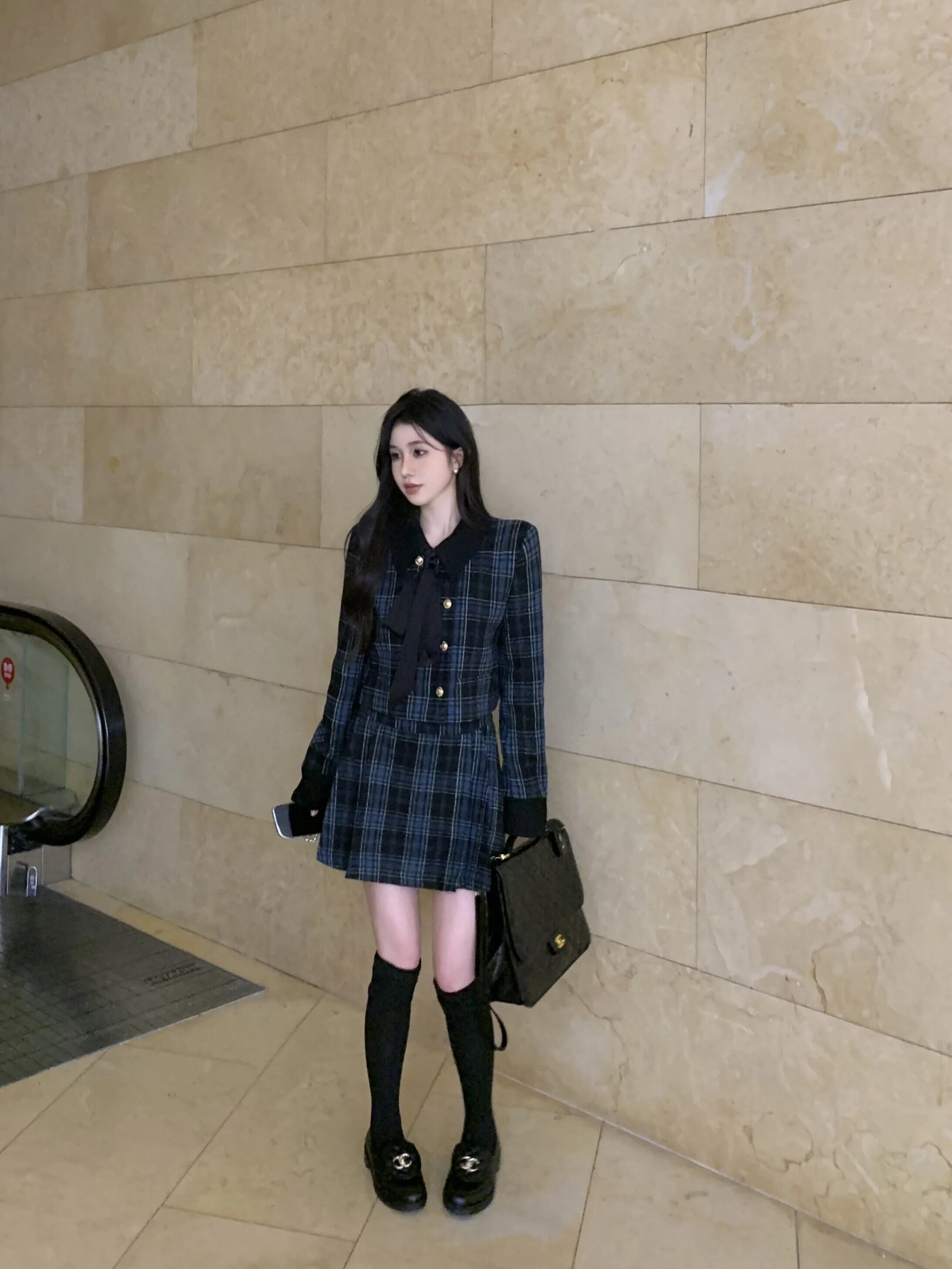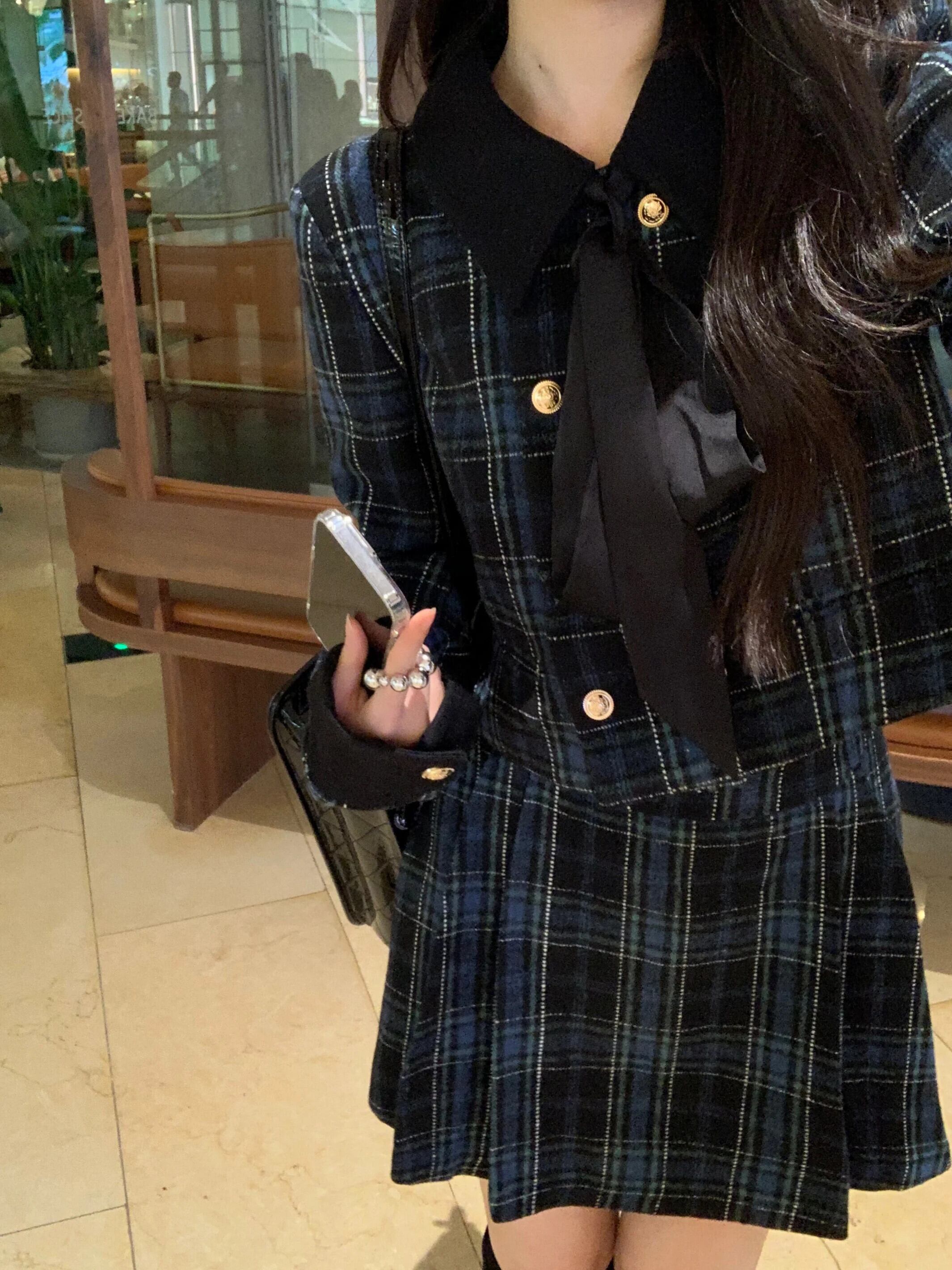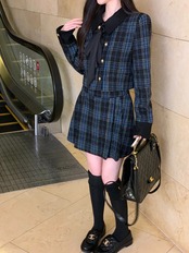 フレンチスイートガールチェック柄スーツ秋長袖ターンダウンカラーコートAラインミニスカートツーピースセット ロング 大人ガーリー スウィート キュート カジュアル オータム 秋物