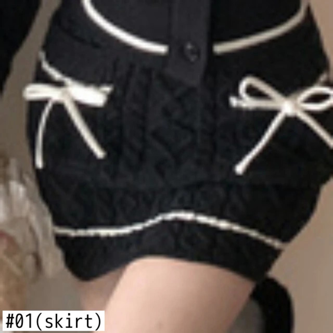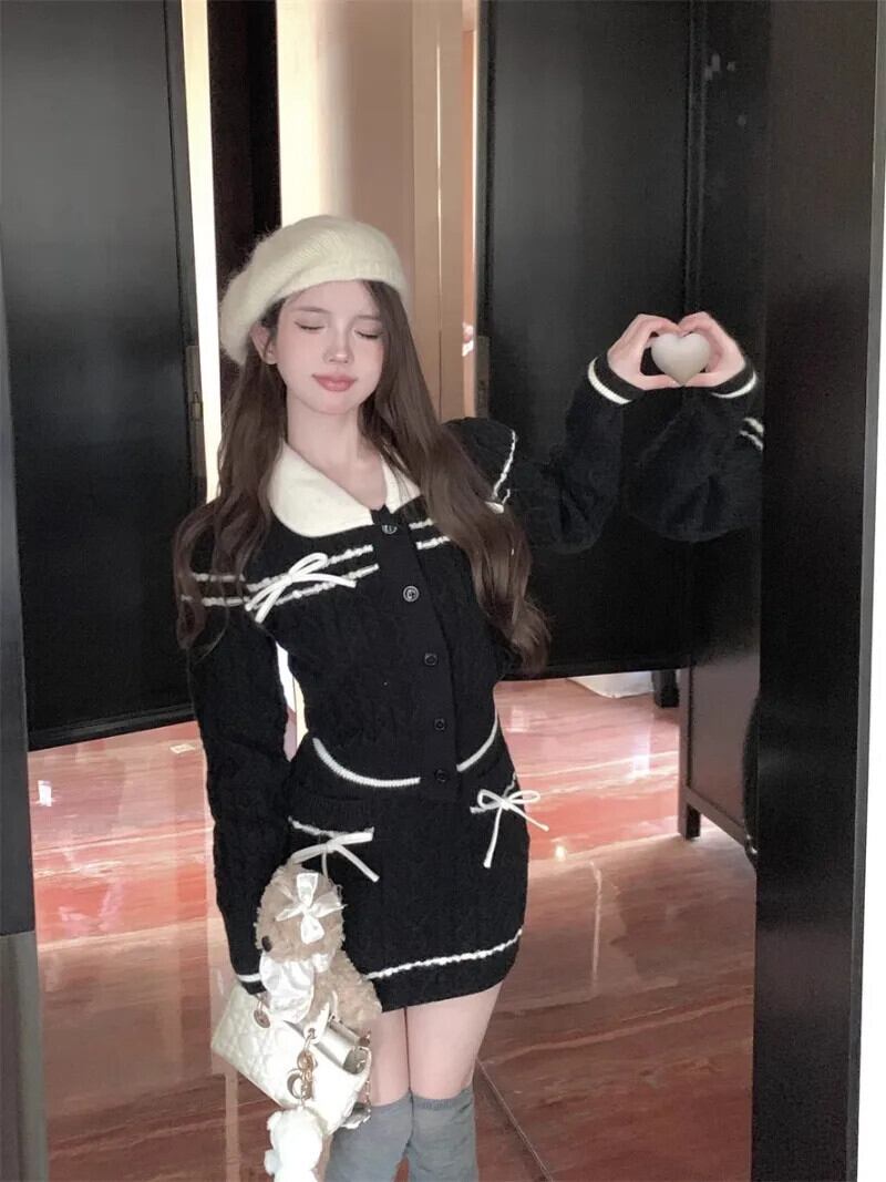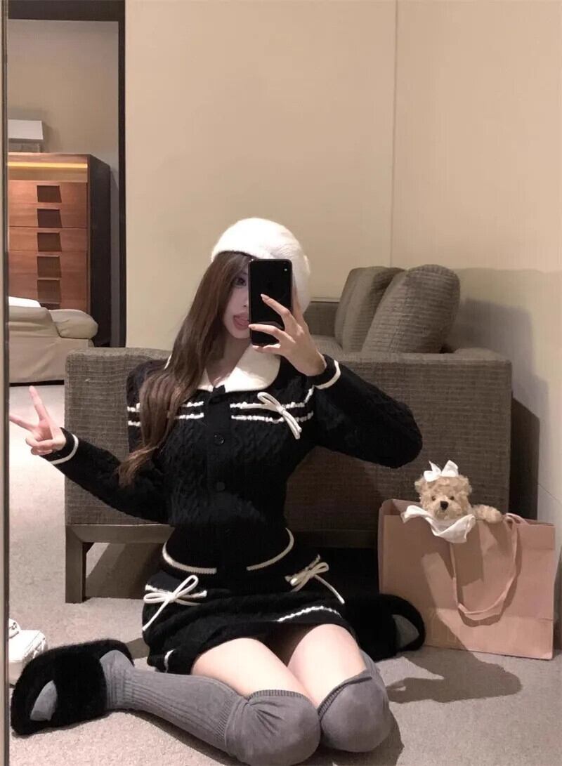 スウィートガールスーツ レディース 秋冬 コントラスト ピーターパンカラー リボンニットシャツ ラップヒップショートスカート 2点セット 大人ガーリー キュート カジュアル オータム 秋物 ウィンター 冬物