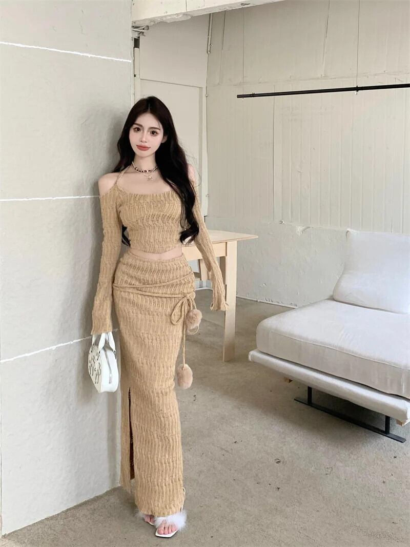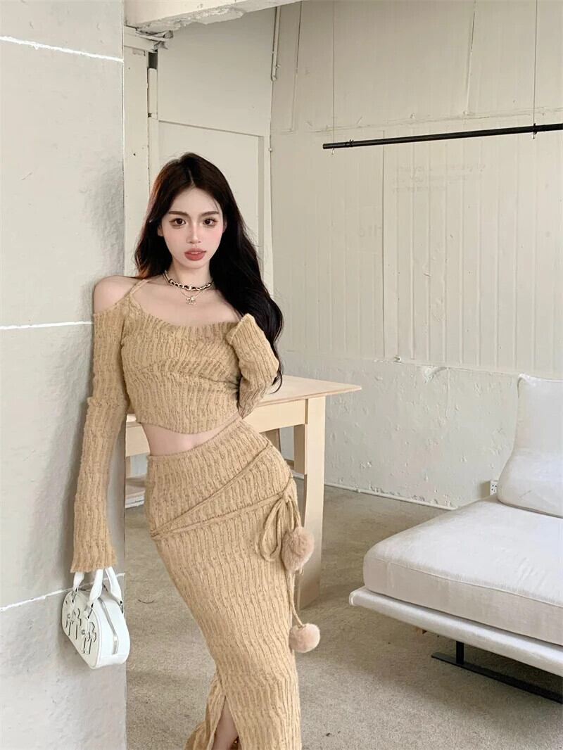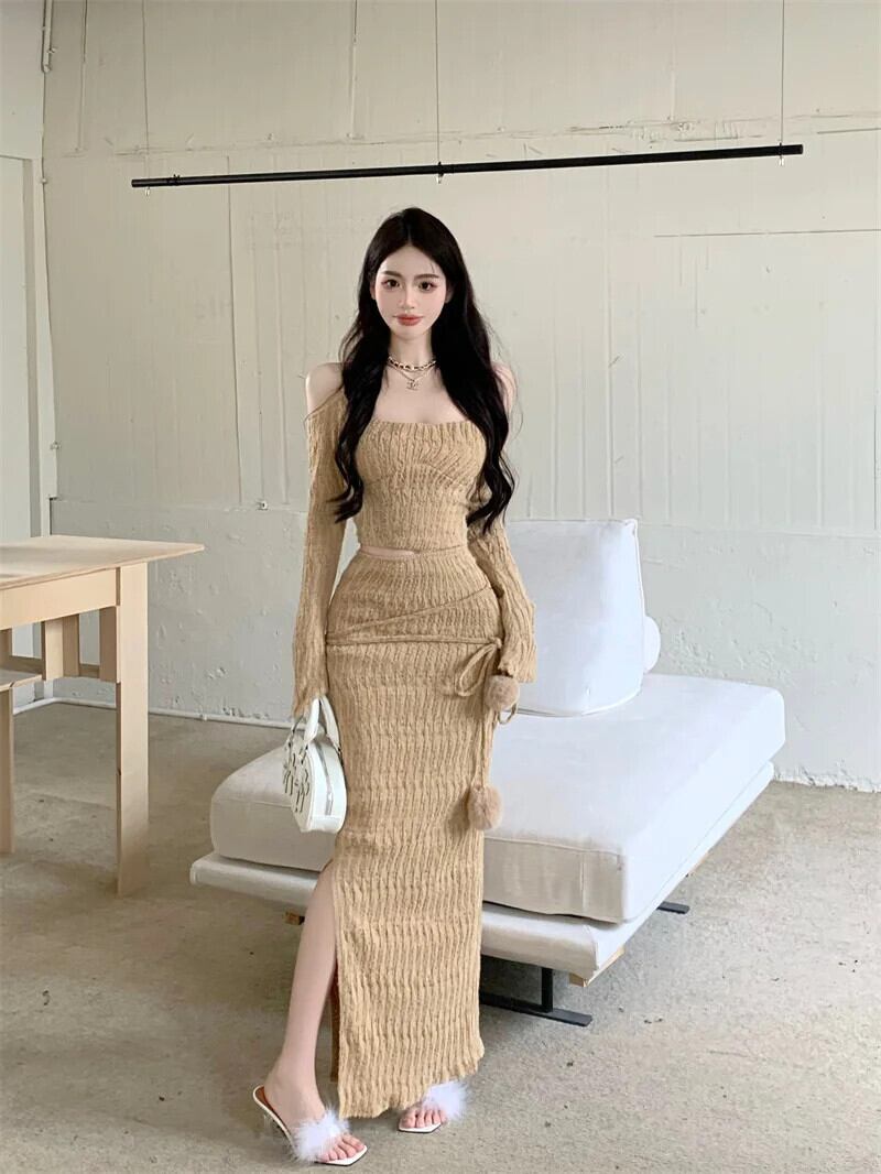 ホットガールスーツ秋/冬オフショルダー長袖スリムフィットトップスプリットラップヒップスカートツーピースセット ロング オータム 秋物 ウィンター 冬物