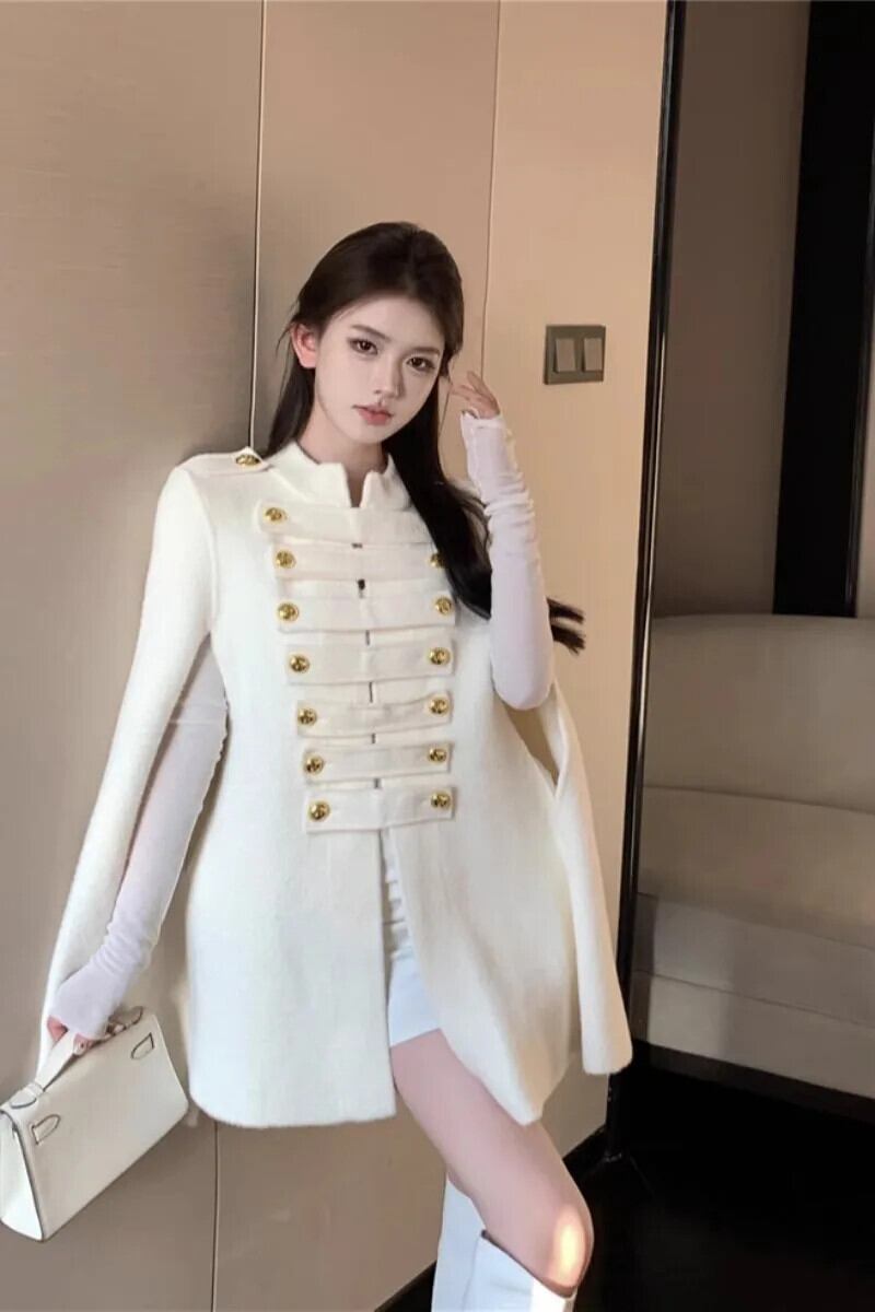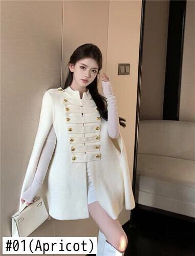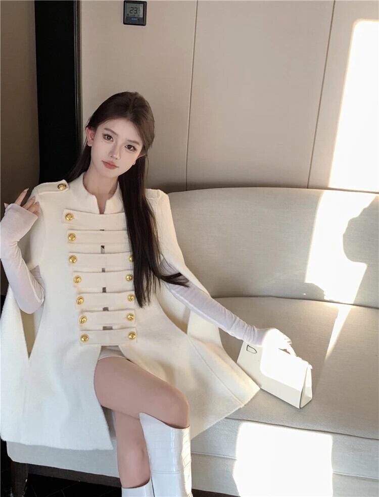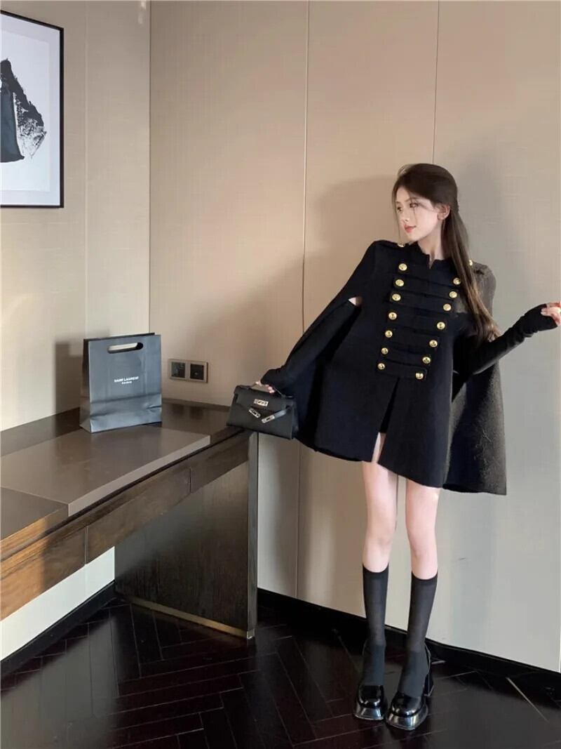 甘いホットガールメタルボタンニットウールコート秋/冬長袖ラウンドネックケープコート ロング 大人ガーリー スウィート キュート カジュアル オータム 秋物 ウィンター 冬物 Oネック