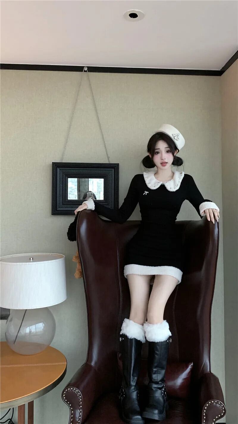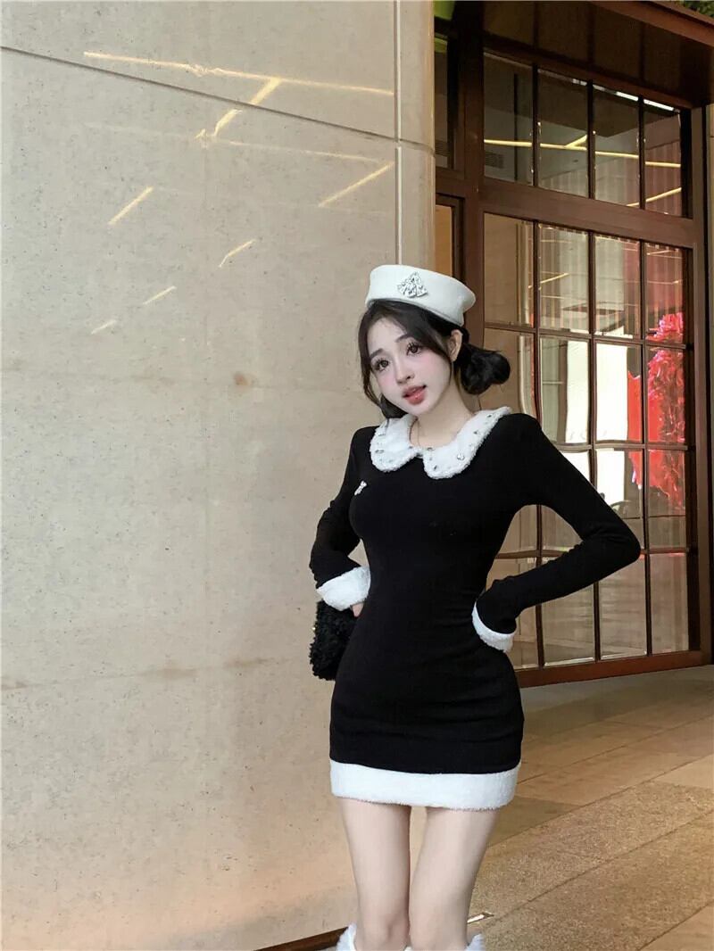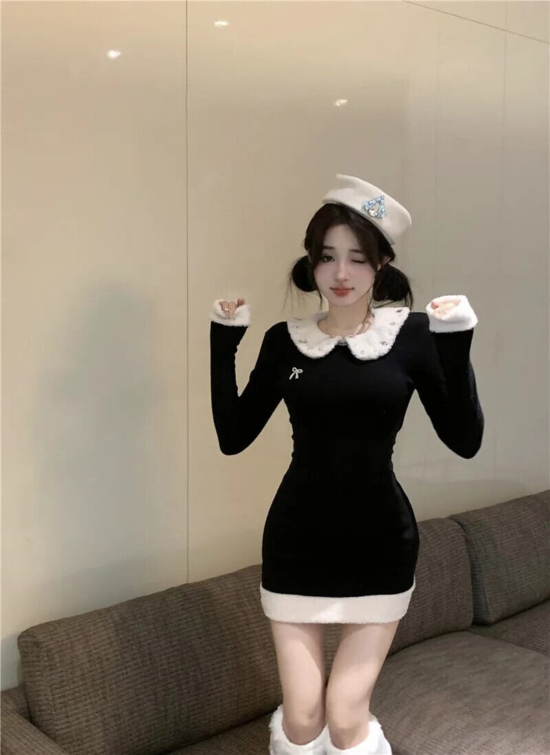 スウィートガールラインストーンピーターパン襟ぬいぐるみドレス秋と冬黒タイトラップヒップショートドレス ブラック 大人ガーリー キュート カジュアル オータム 秋物 ウィンター 冬物