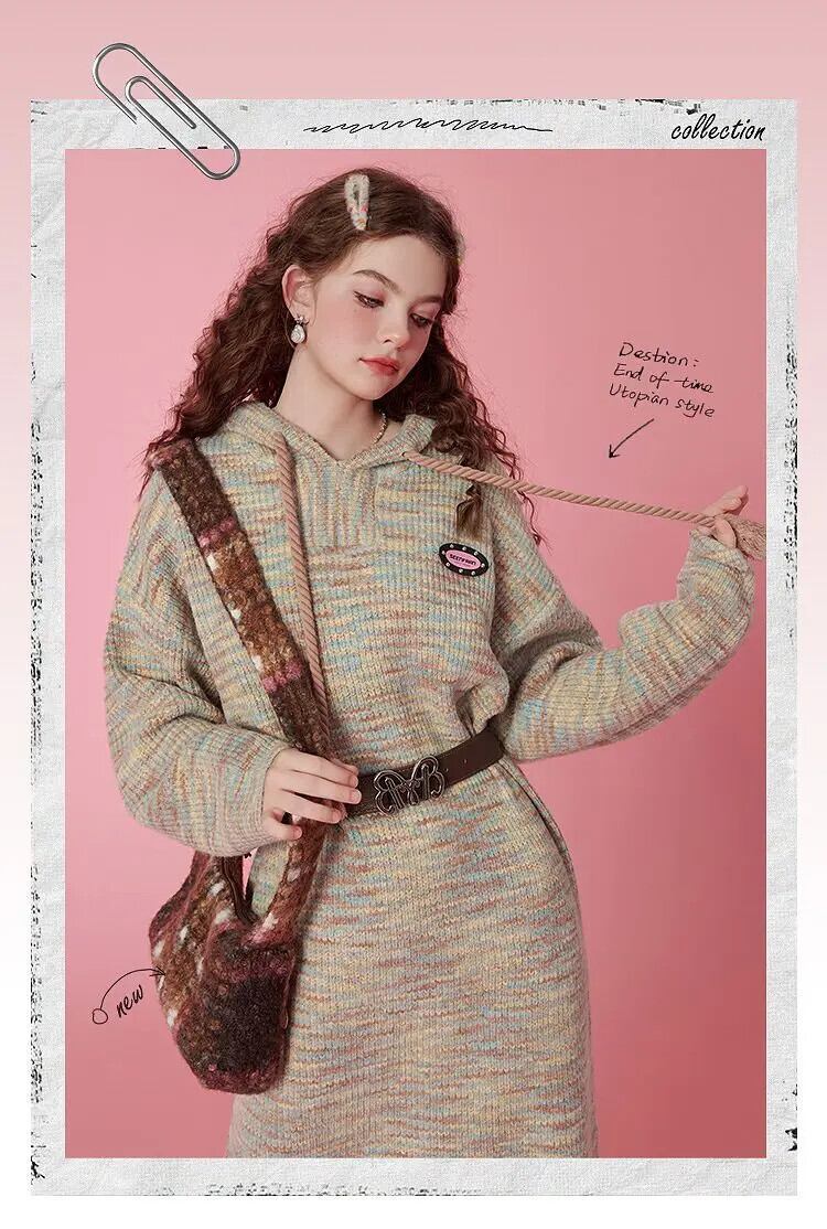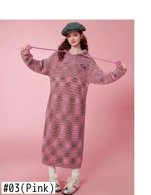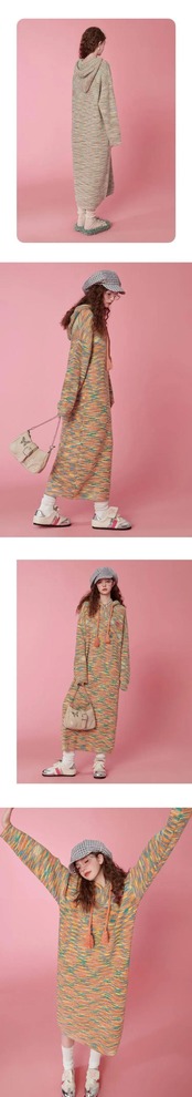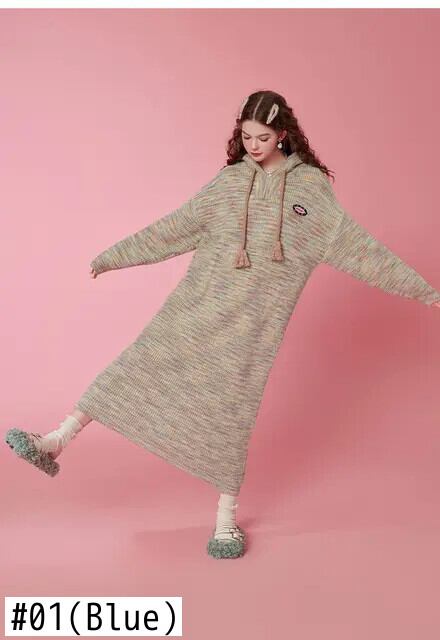 甘いホットガールニットドレス秋と冬長袖フード付きミッドレングスルーズフィットドレス ロング 大人ガーリー スウィート キュート カジュアル オータム 秋物 ウィンター 冬物