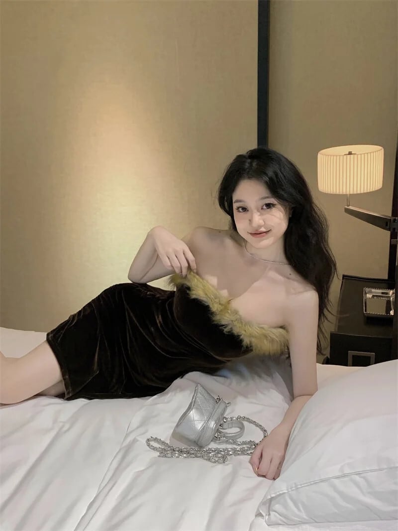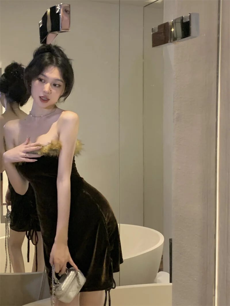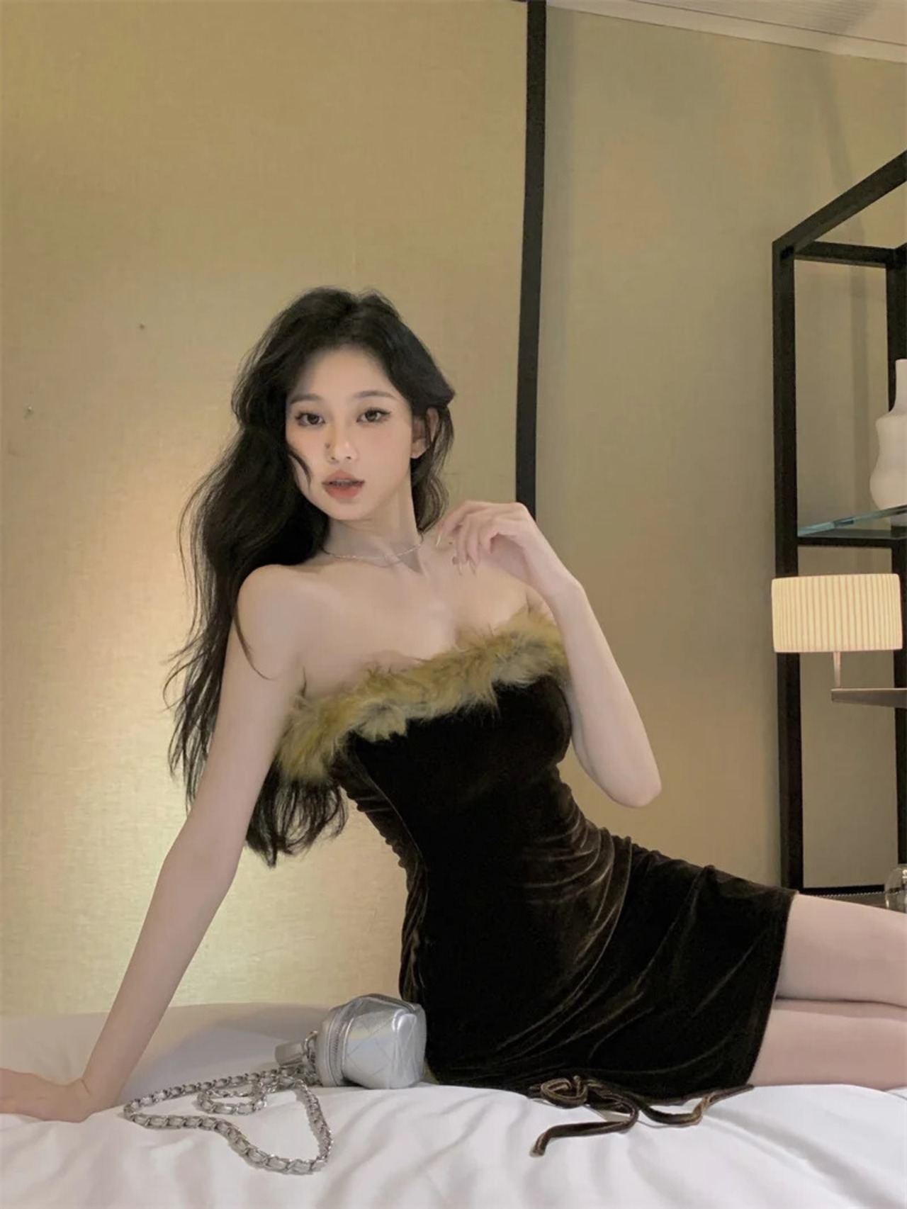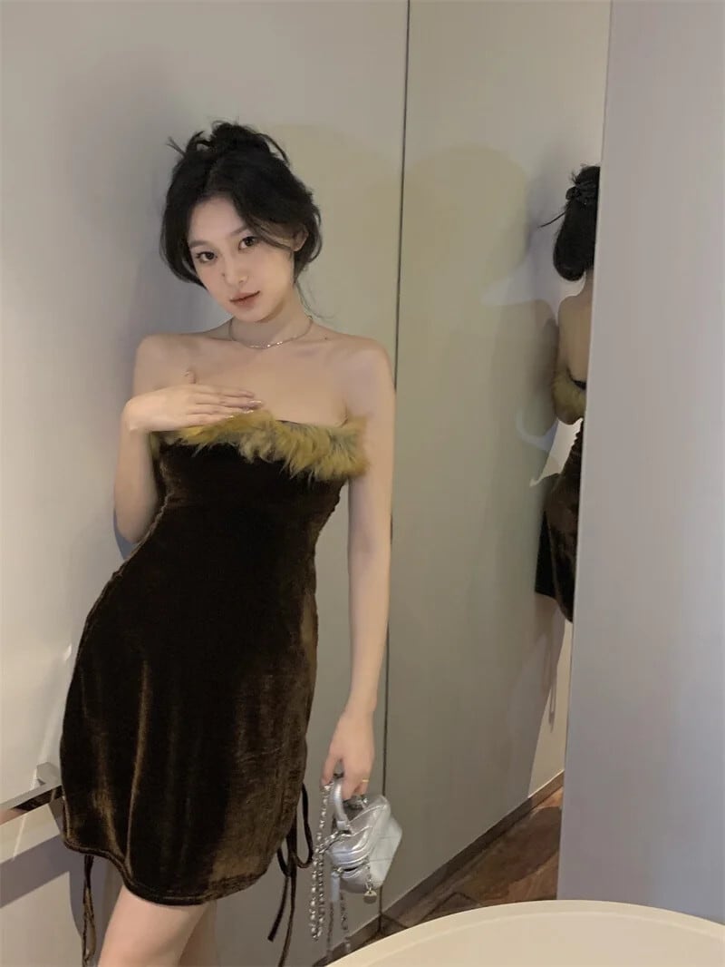 Sweet Girl 豪華ベルベットストラップレスドレス秋/冬ボトムセクシースリムフィット巾着レースアップショートドレス 大人ガーリー スウィート キュート カジュアル オータム 秋物 ウィンター 冬物
