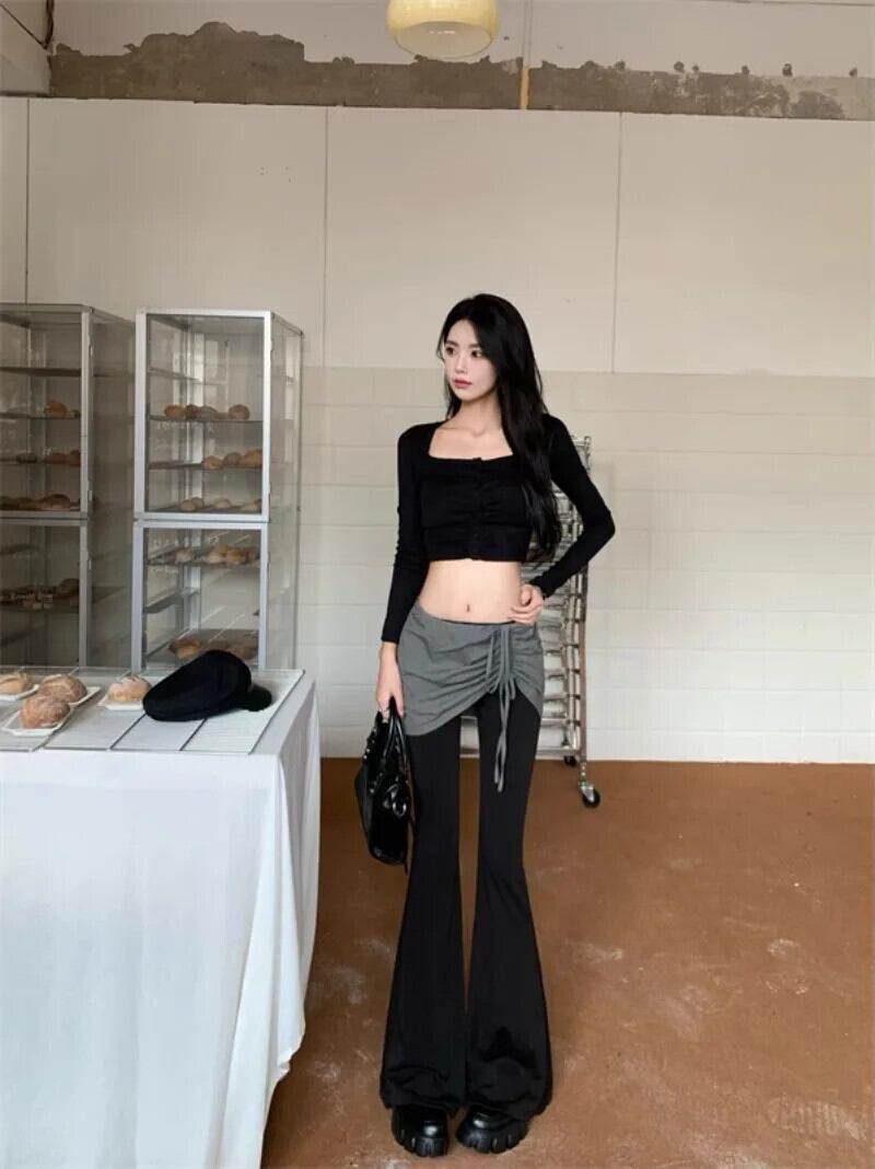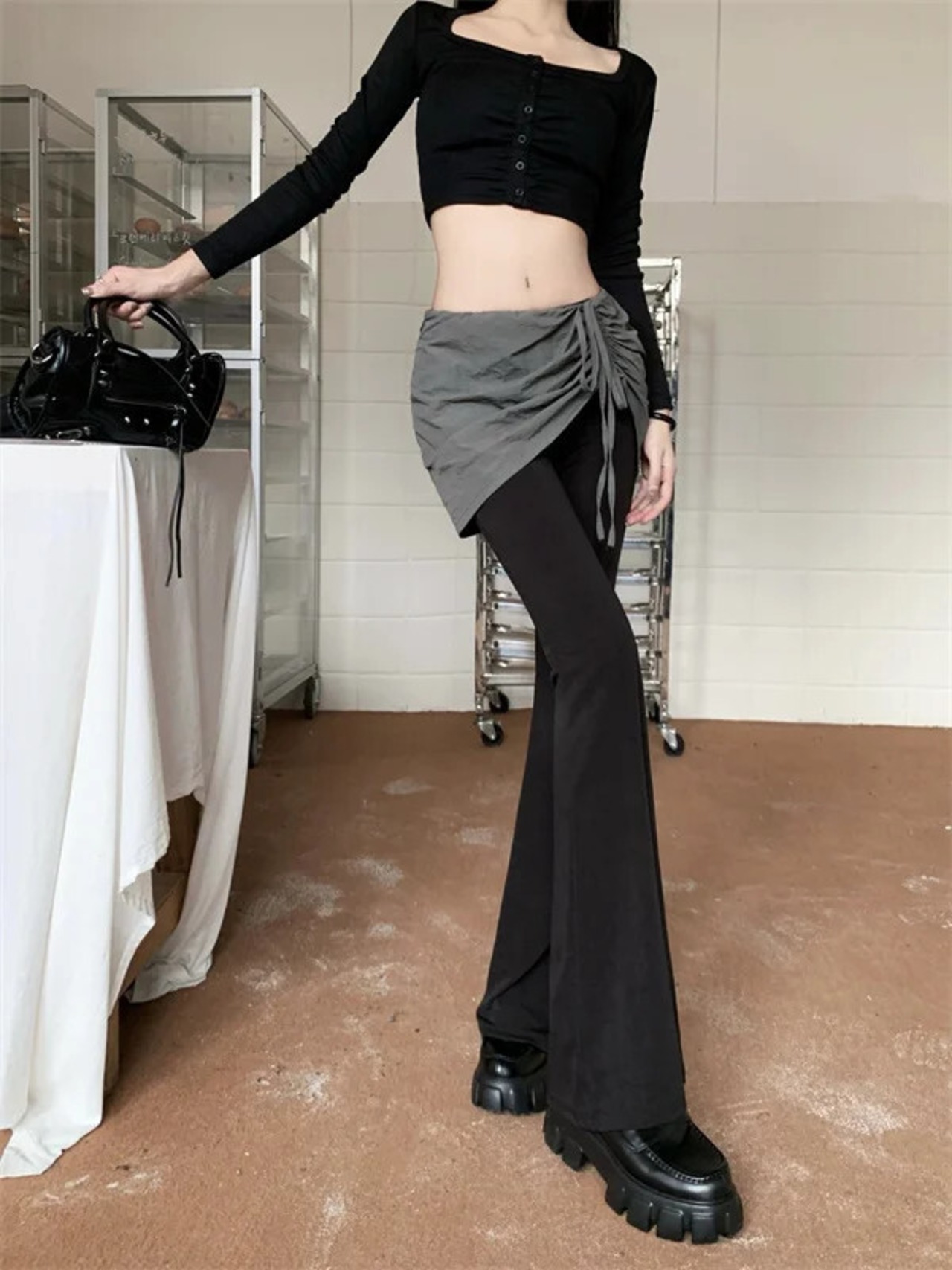 ホットガール不規則巾着ローウエストパンツ秋偽ツーピーススリムフィットマイクロフレアパンツ オータム 秋物