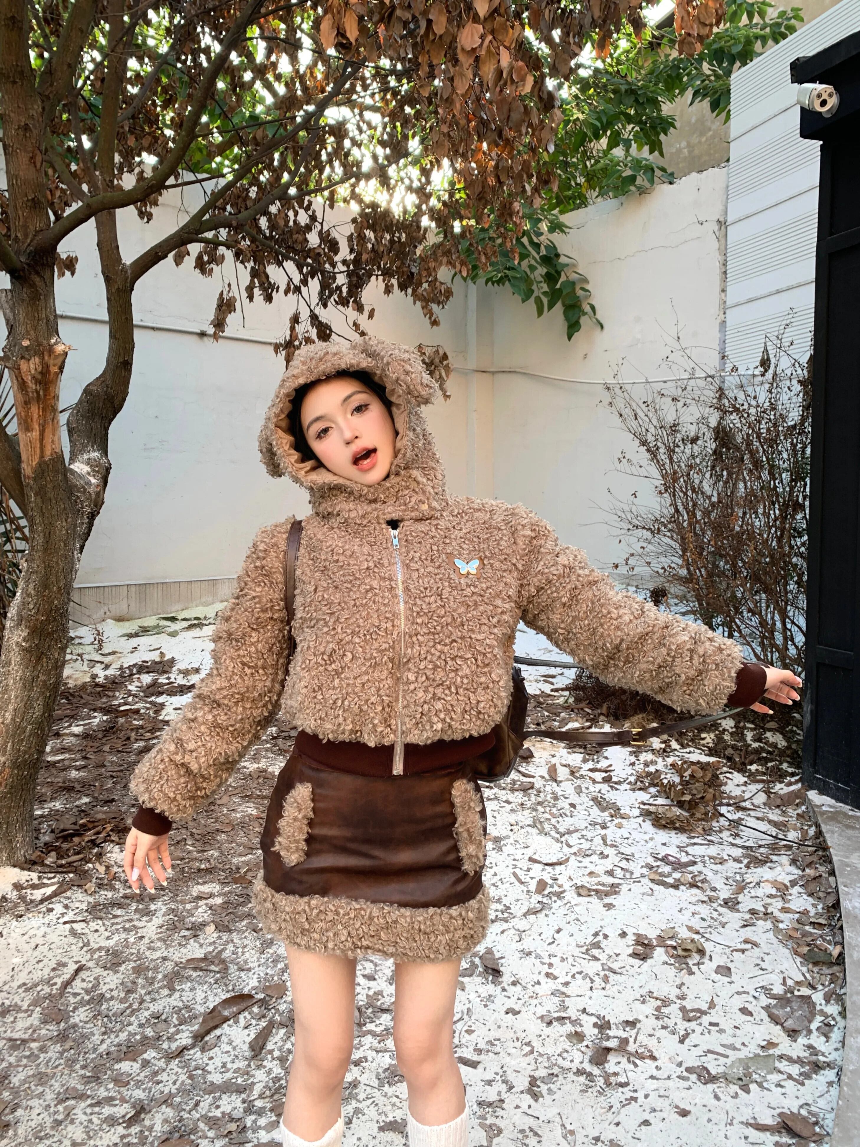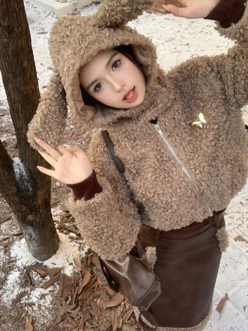 メイラードスタイルレトロスーツ秋フード付きコットンショートジャケットウエストミニスカートツーピースセット オータム 秋物