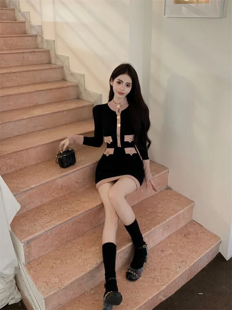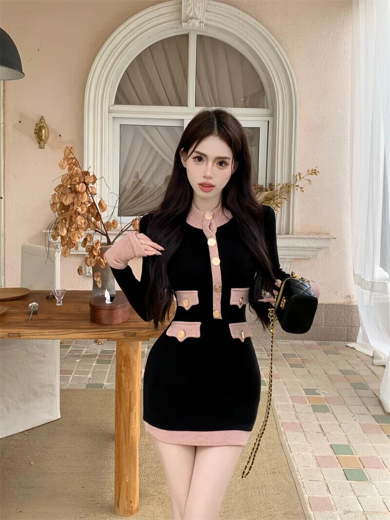 Sweet Girl 純粋セクシーカラーコントラストニットドレス秋/冬長袖ボトムラップヒップショートドレス ロング 大人ガーリー スウィート キュート カジュアル オータム 秋物 ウィンター 冬物 ピュア