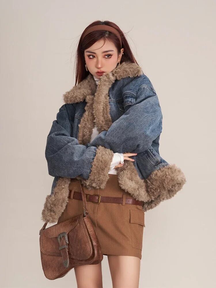 甘いホットガールデニムぬいぐるみコート秋と冬ルースと肥厚ラムウールコットンジャージー 大人ガーリー スウィート キュート カジュアル オータム 秋物 ウィンター 冬物