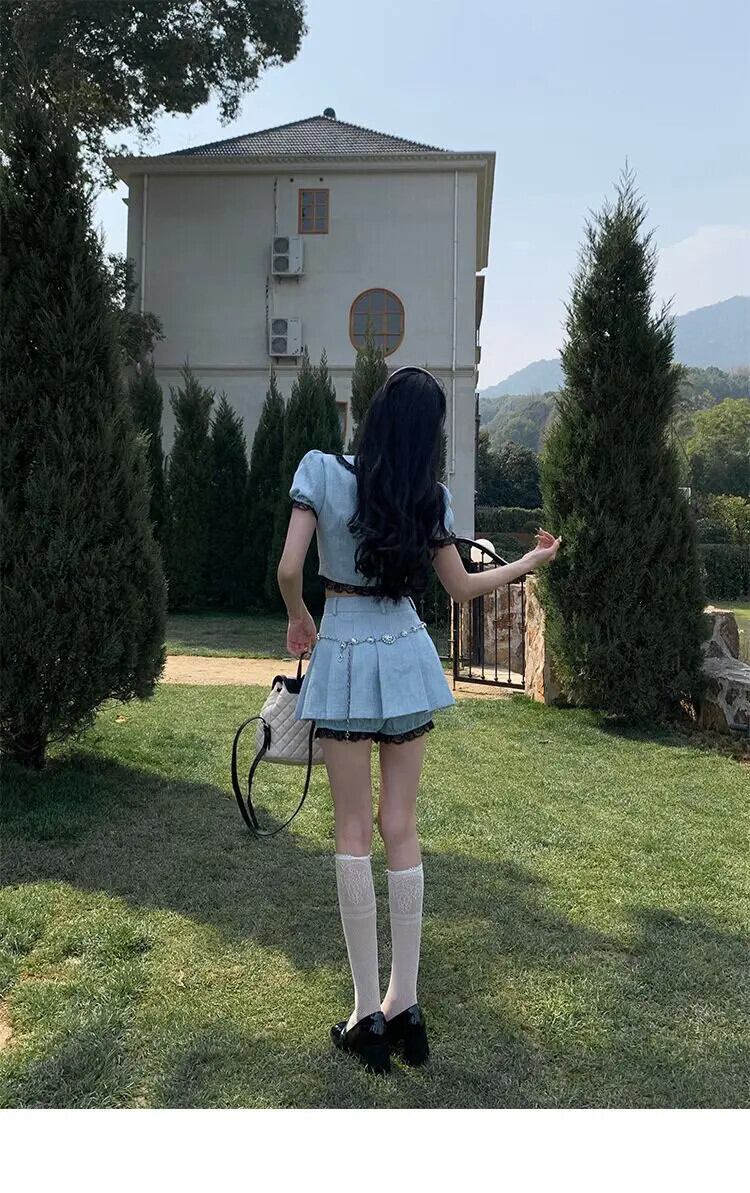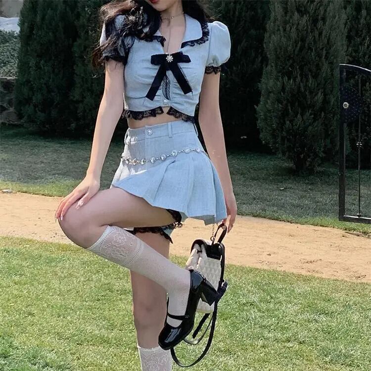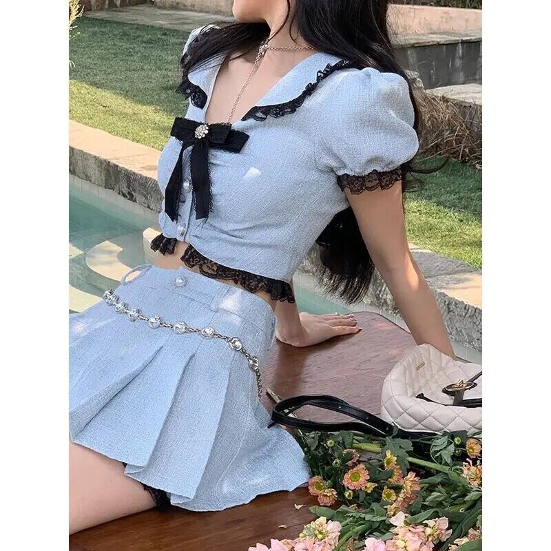 甘いホットガールブルースーツ夏バブルスリーブレースショートトップウエストプリーツミニスカートツーピースセット 大人ガーリー スウィート キュート カジュアル サマー 夏物