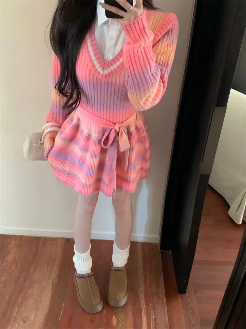 甘いホットガールスタイルスーツ秋 V ネックコントラストニットドレスシャツトップ 2 点セット 大人ガーリー スウィート キュート カジュアル オータム 秋物 Vネック
