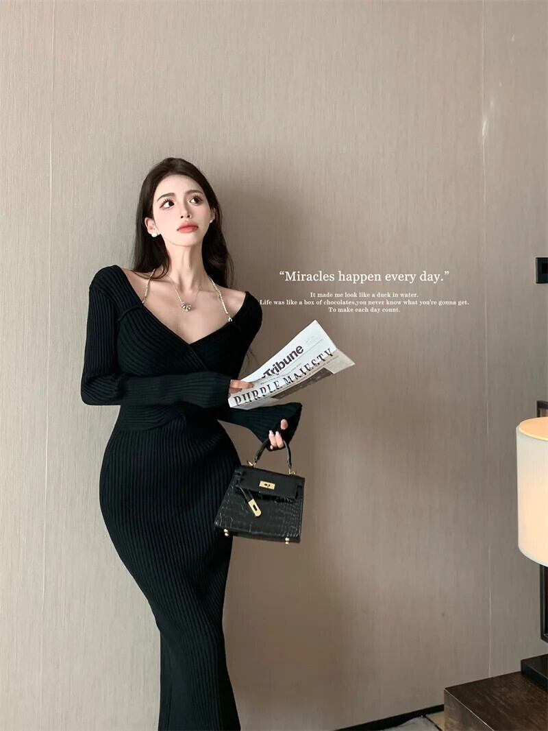 ホットガール V ネックホルターネック長袖ニットドレス秋と冬スリムフィットラップヒップロングドレス オータム 秋物 ウィンター 冬物 Vネック