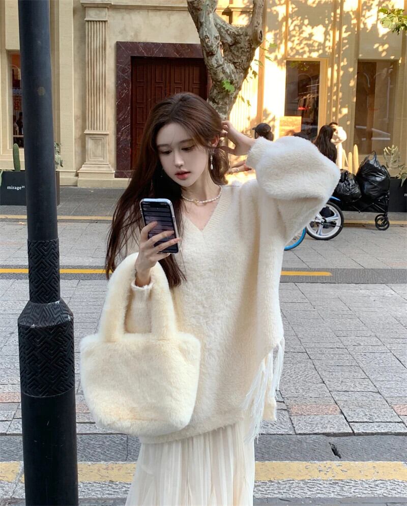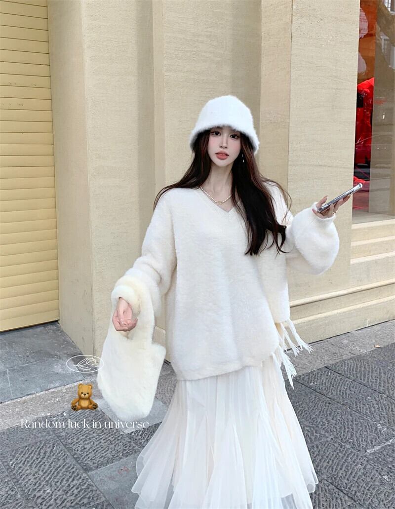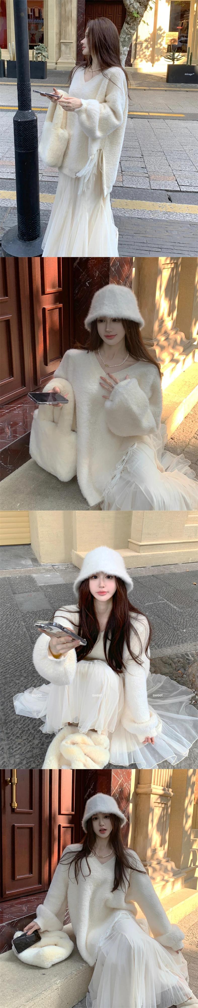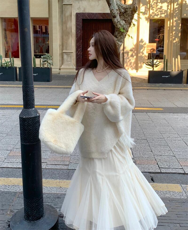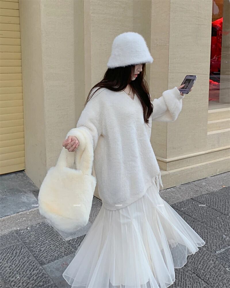 甘いホットガールスーツ秋/冬ミンクベルベットテル長袖セーター妖精 A ラインメッシュスカート 2 点セット ロング 大人ガーリー スウィート キュート カジュアル オータム 秋物 ウィンター 冬物 Aライン