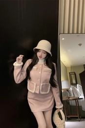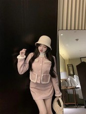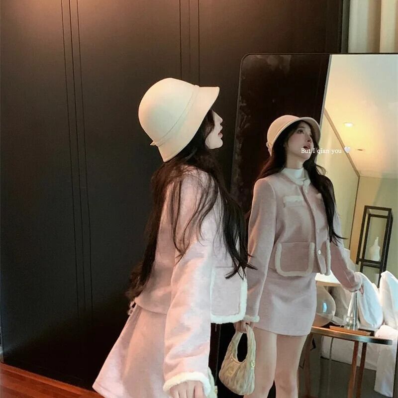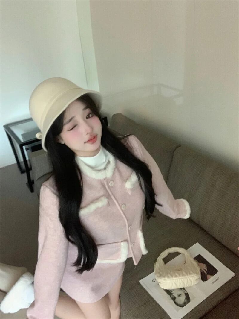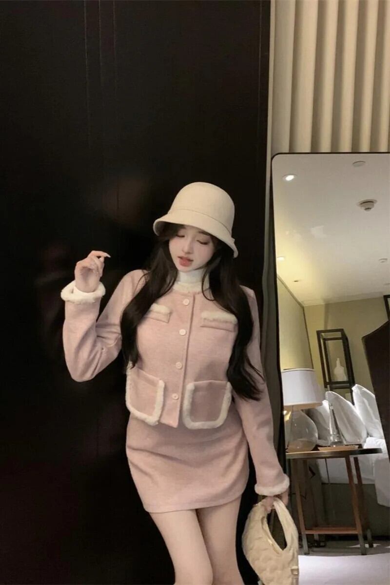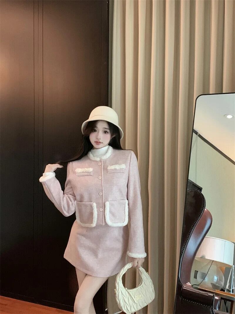 甘いホットガールピンクスーツ秋長袖豪華ショートコートウエストミニスカート 2 点セット ロング 大人ガーリー スウィート キュート カジュアル オータム 秋物