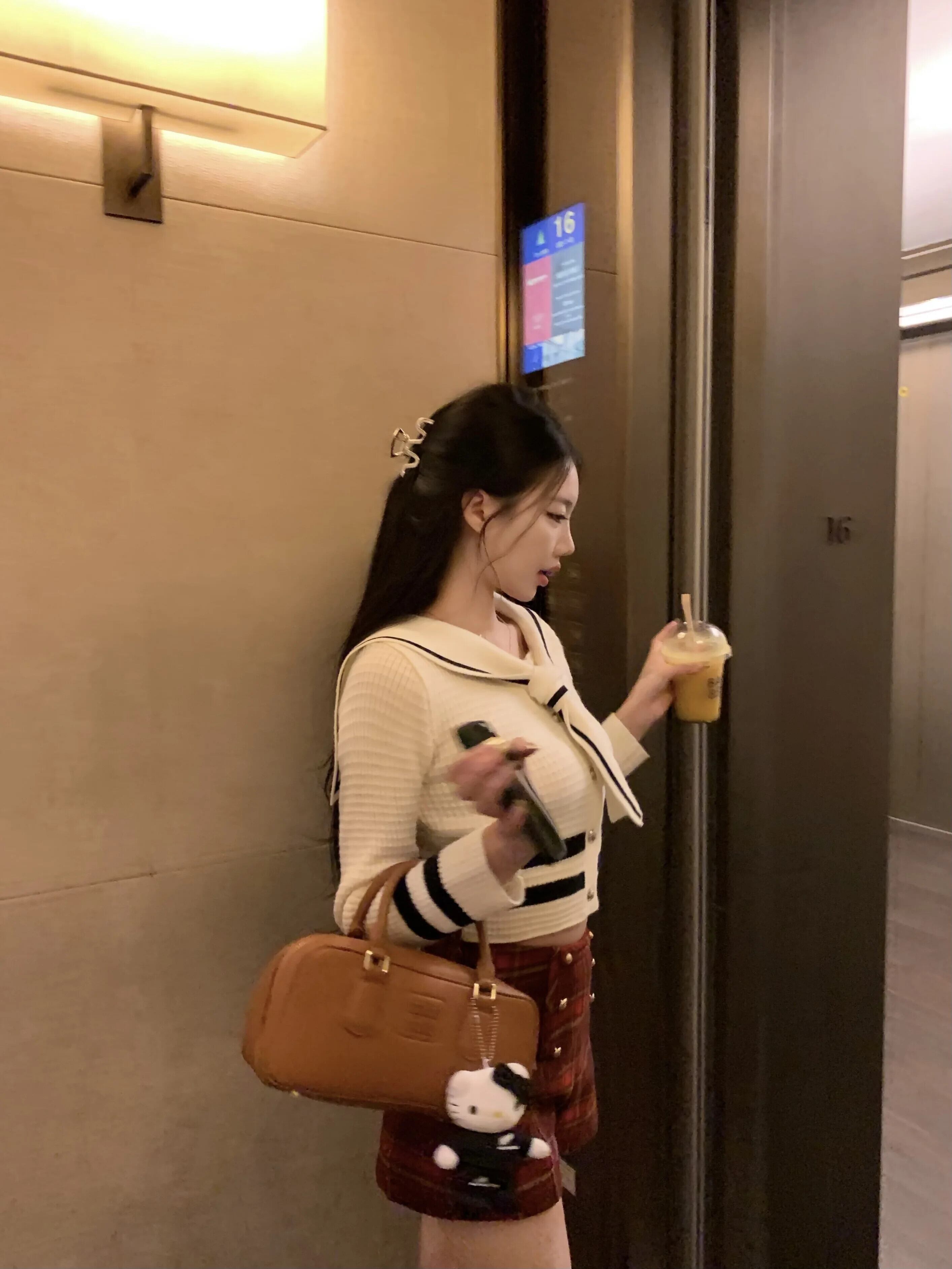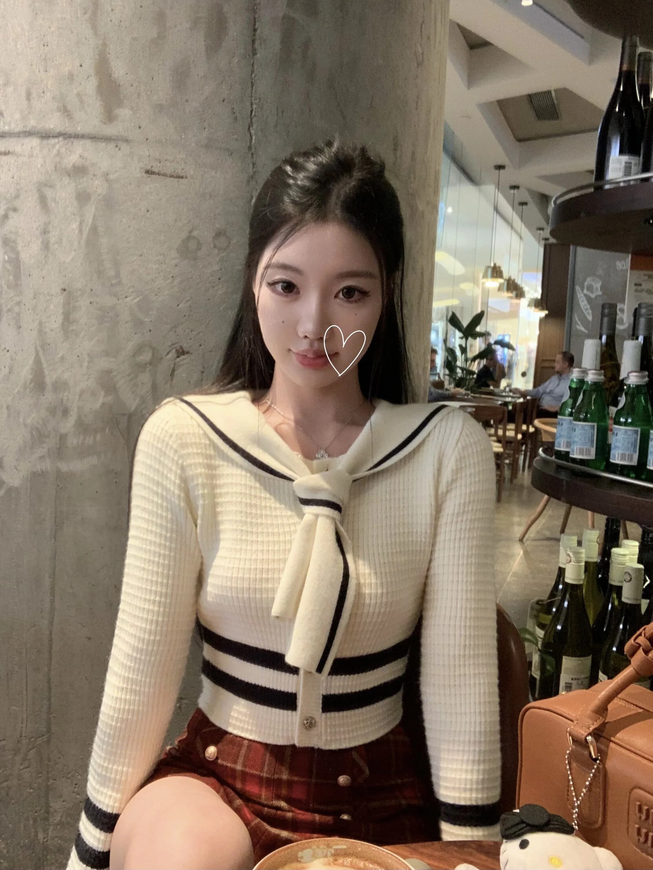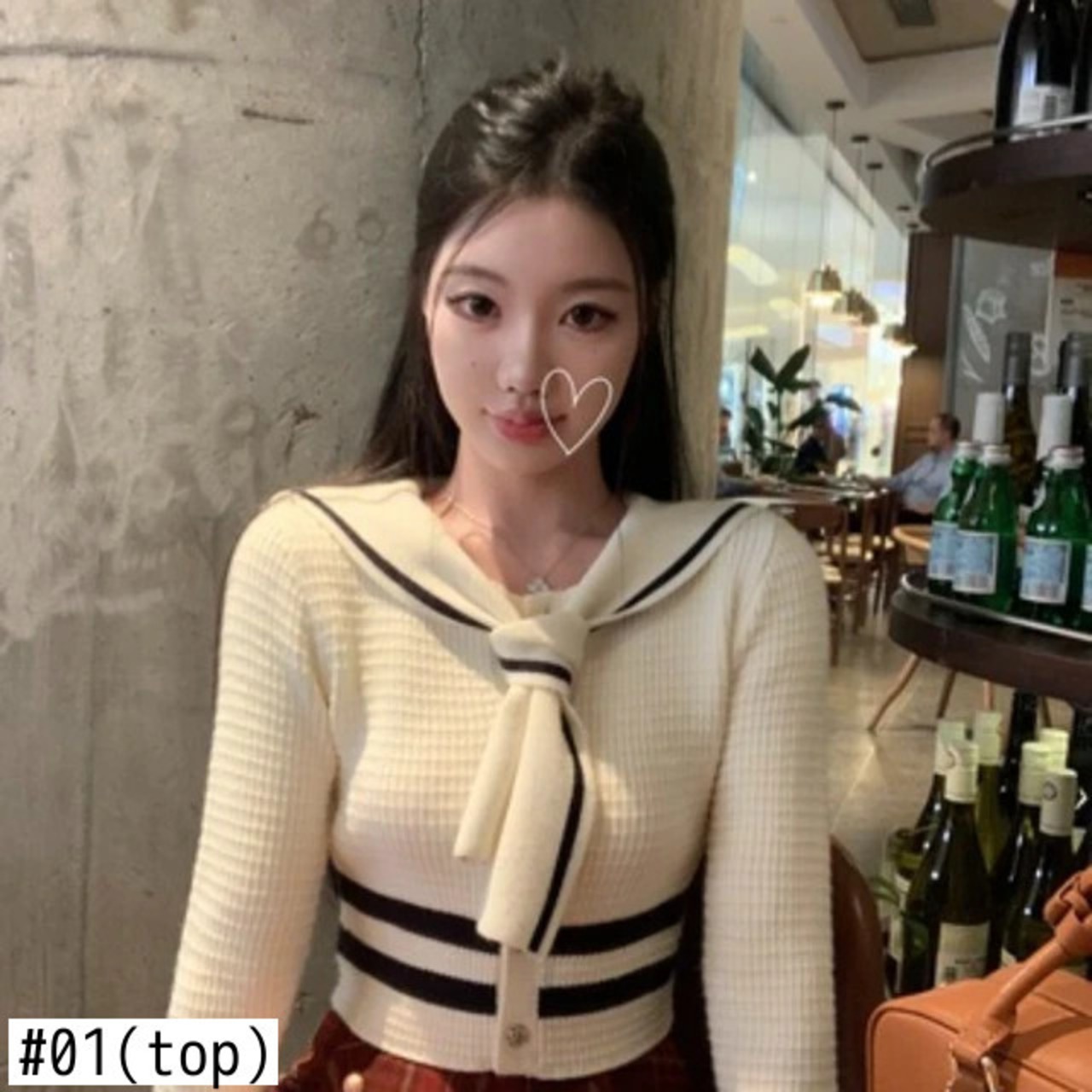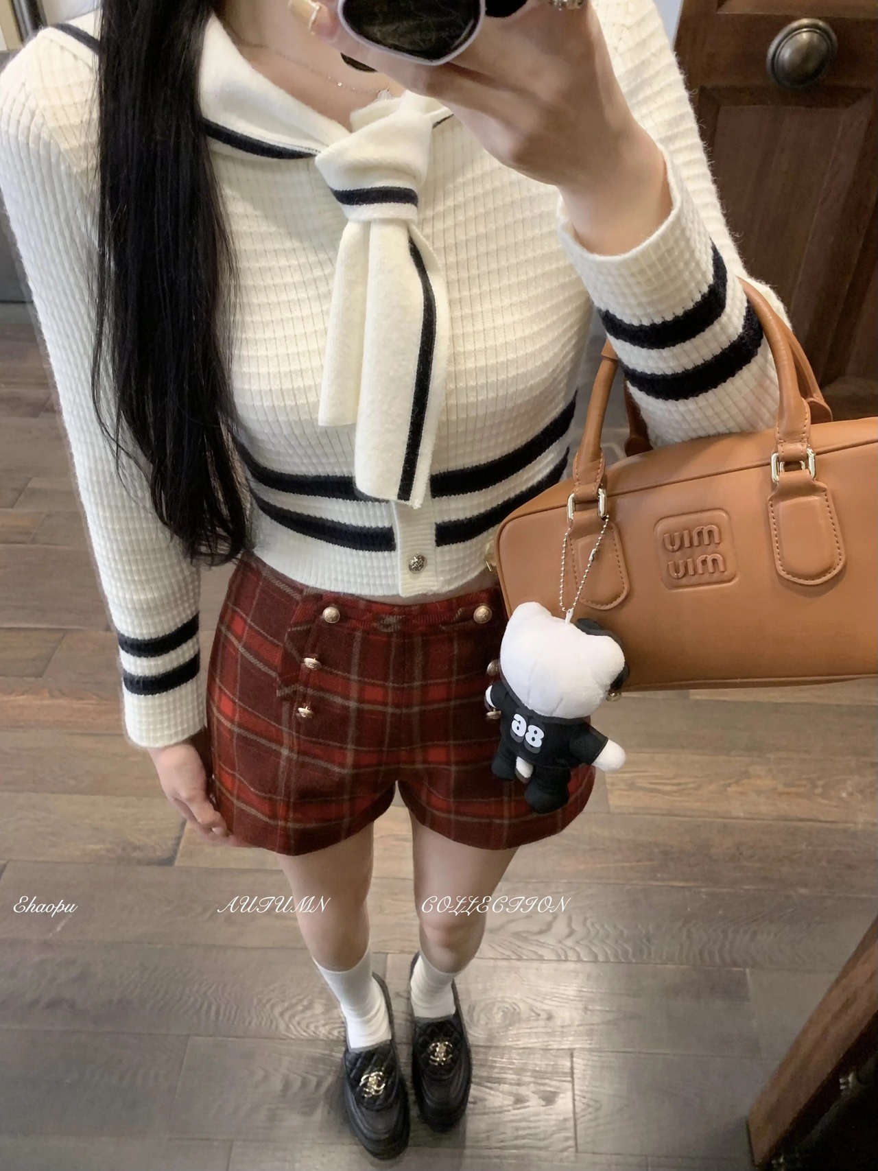 スイートホットガールズスタイルスーツ秋セーラー襟ニットカーディガンウエストチェック柄ショーツ 2 点セット 大人ガーリー スウィート キュート カジュアル オータム 秋物 ブルマー