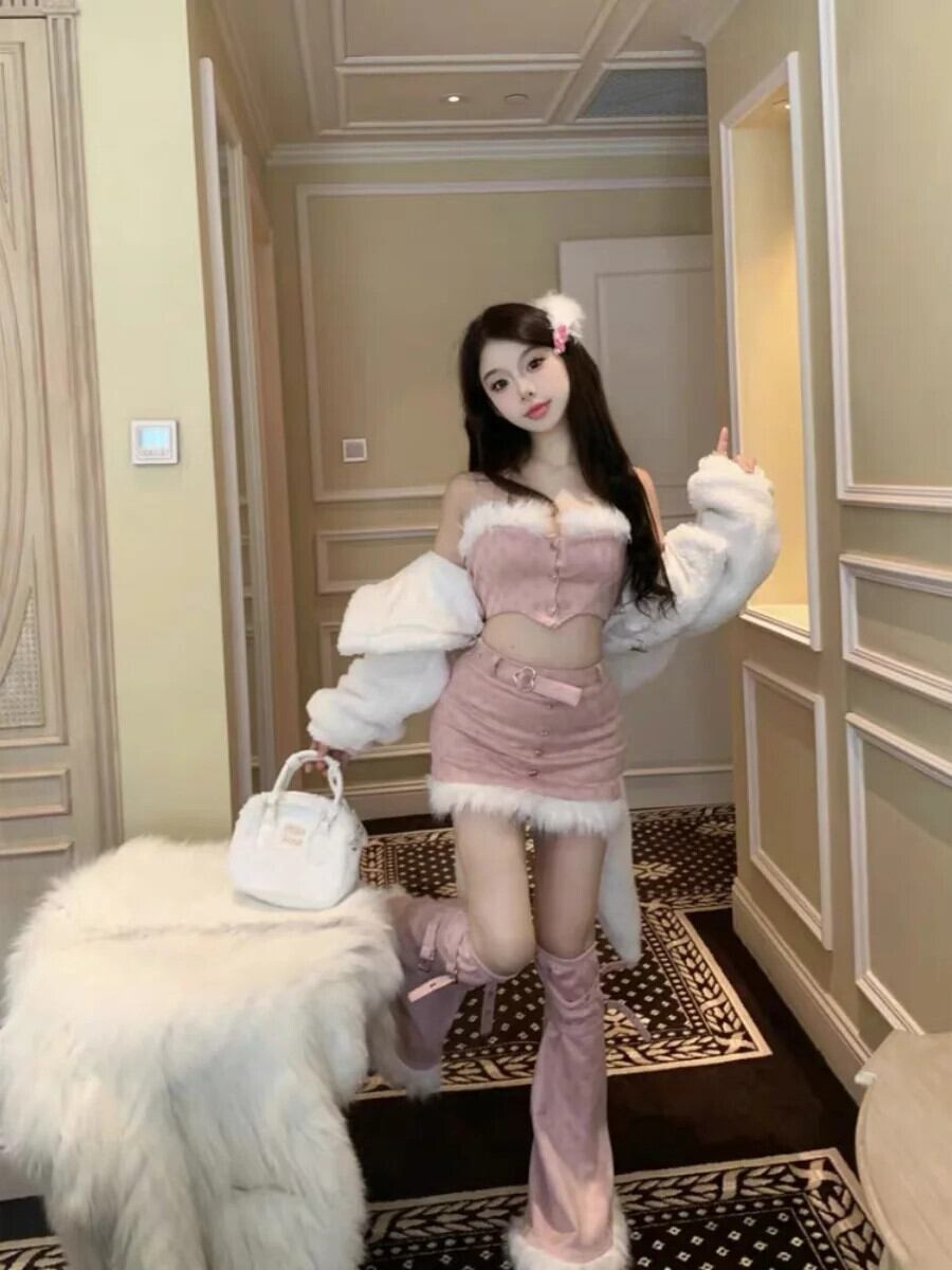 スイートホットガールスーツ レディース 秋冬 ウサギ耳ぬいぐるみカーディガン キャミソール ショートスカート レッグカバー 4点セット 大人ガーリー スウィート キュート カジュアル オータム 秋物 ウィンター 冬物
