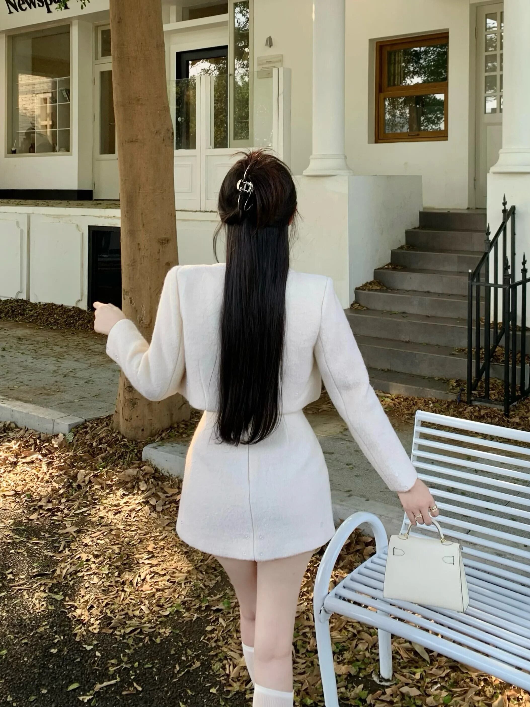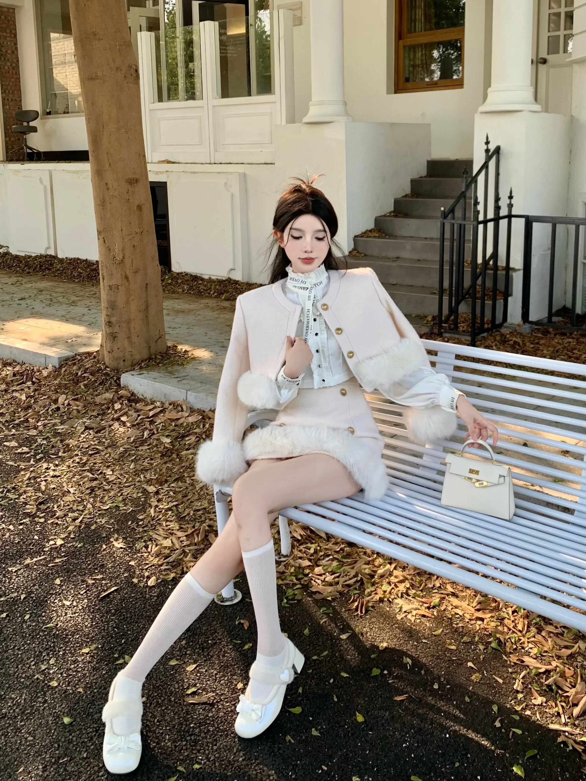 スイートガールスーツ冬レタープリントシャツ取り外し可能ファーコートウエストミニスカート 3 点セット 大人ガーリー スウィート キュート カジュアル ウィンター 冬物