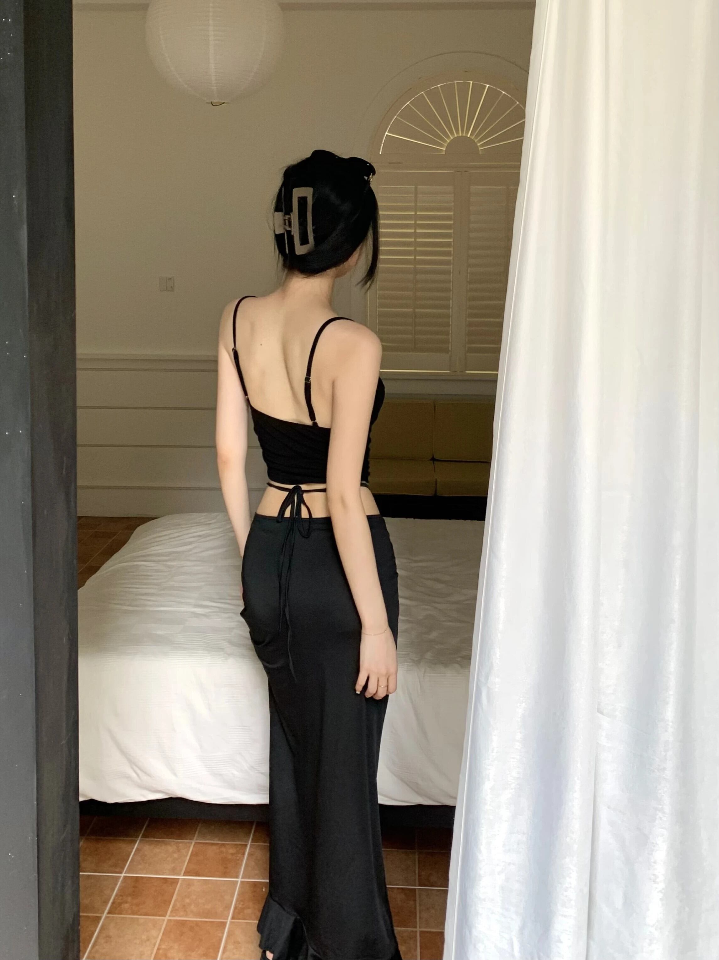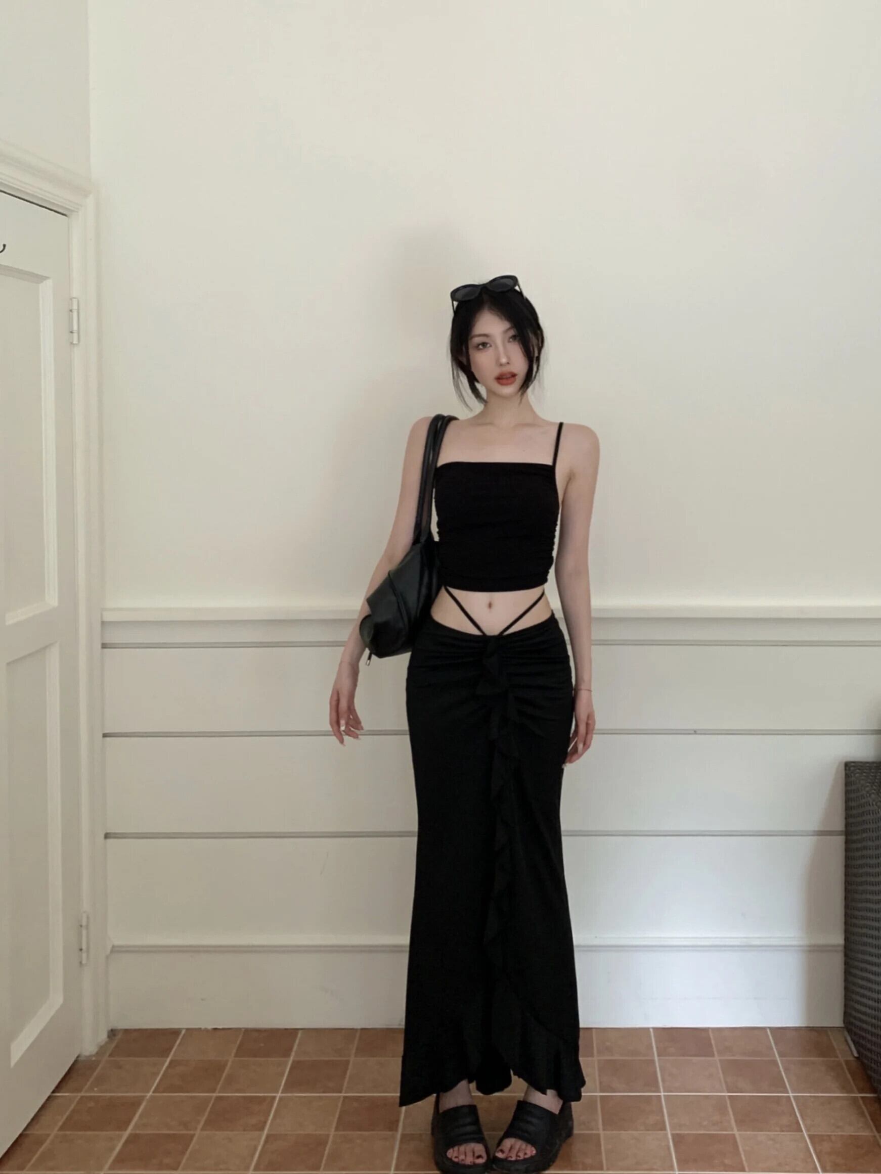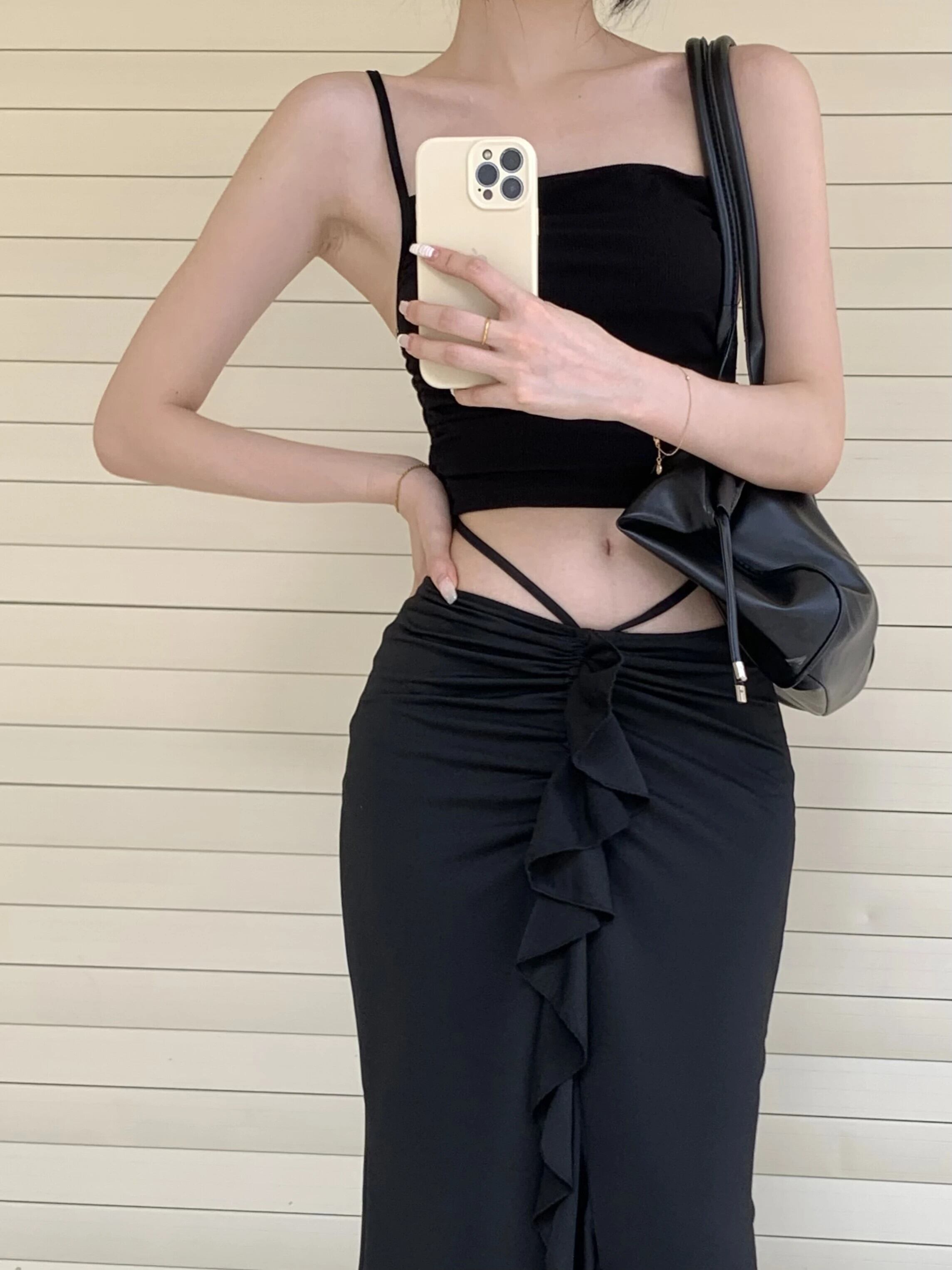 純粋セクシーホットガールスーツ秋黒セクシーストラップタンクトップフリルラップヒップマーメイドロングスカートツーピースセット ブラック オータム 秋物