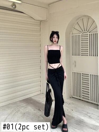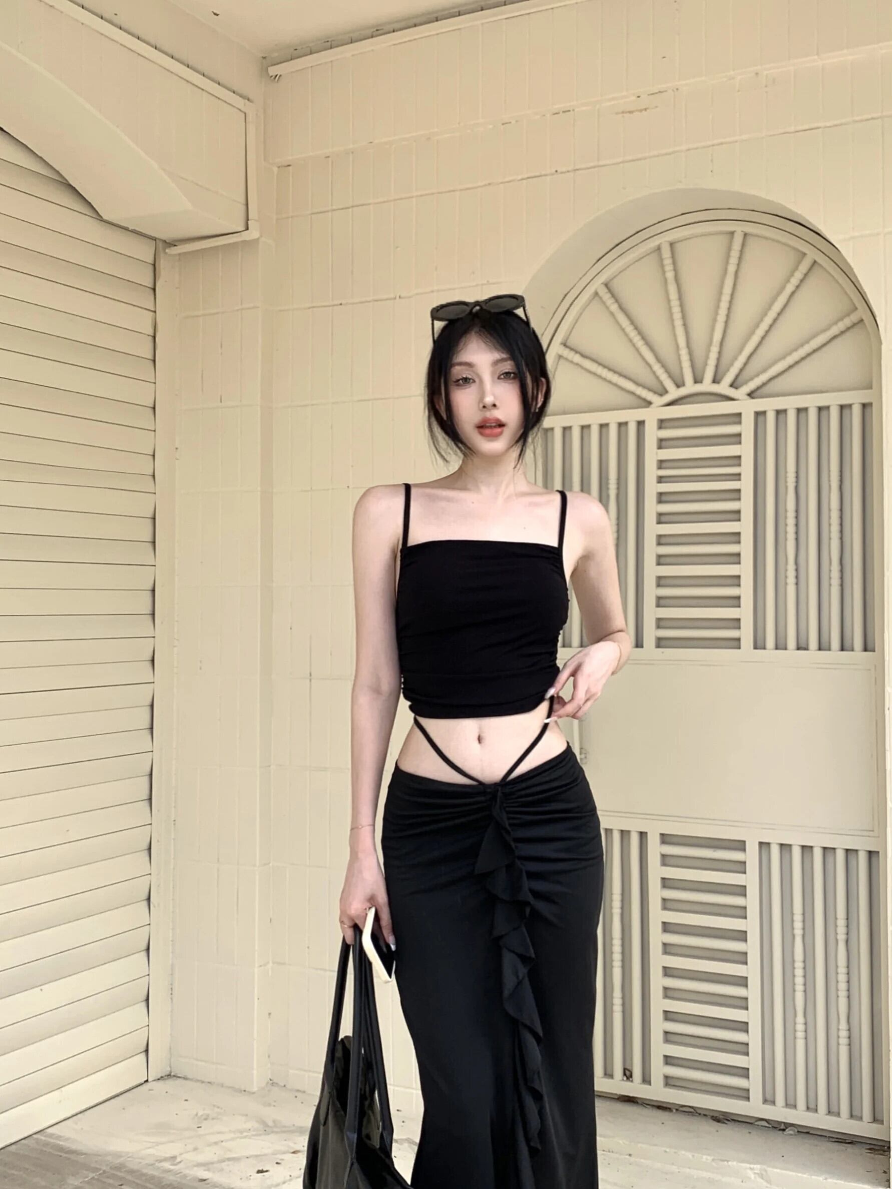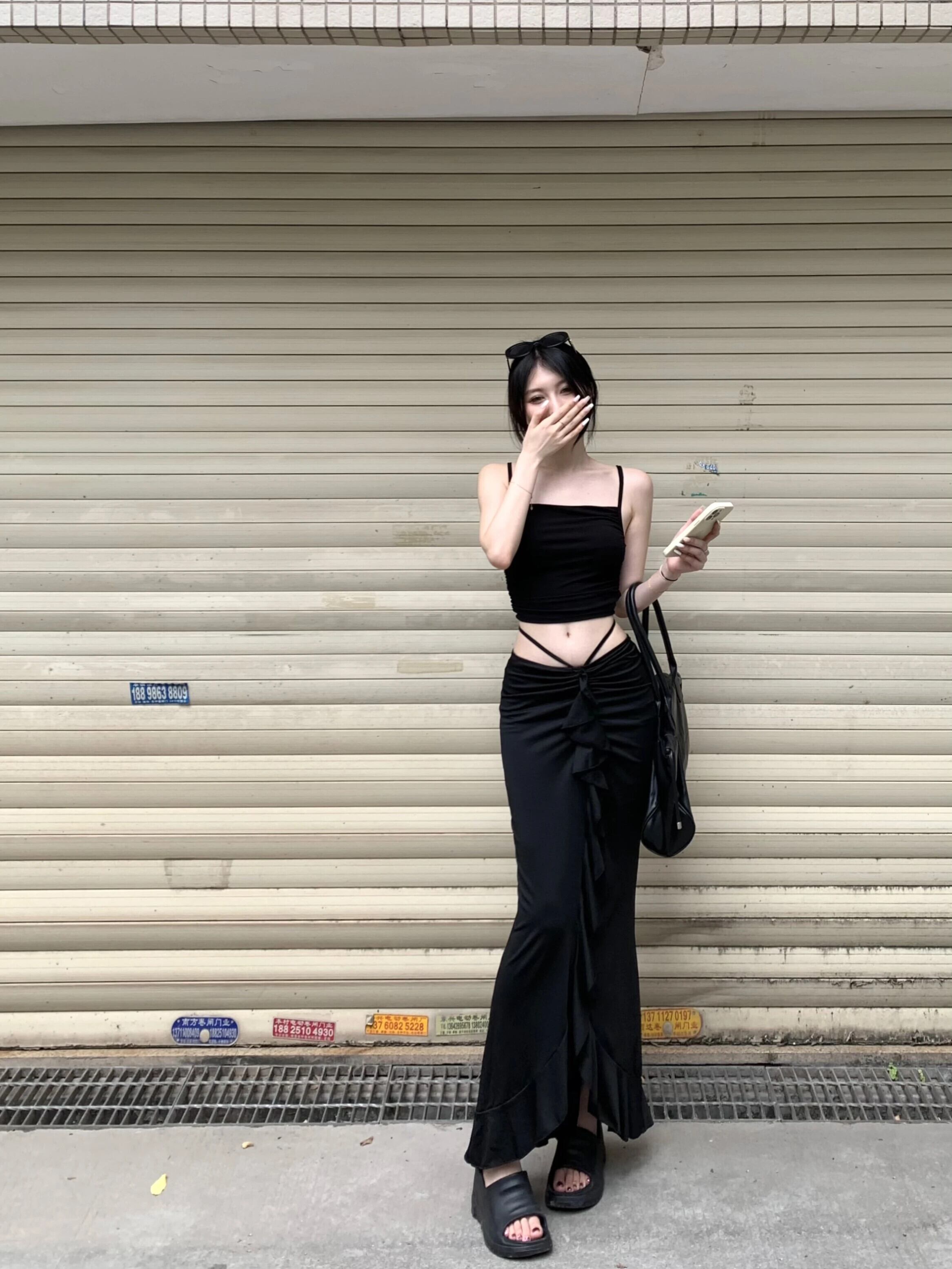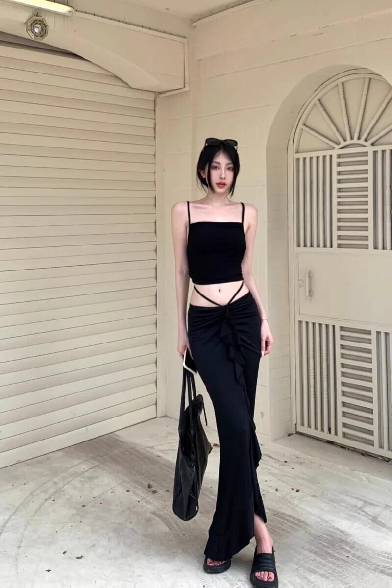 純粋セクシーホットガールスーツ秋黒セクシーストラップタンクトップフリルラップヒップマーメイドロングスカートツーピースセット ブラック オータム 秋物