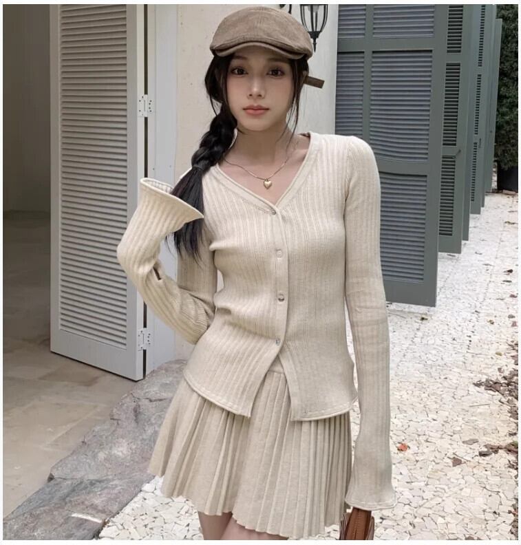 スイートホットガールアプリコットスーツ秋/冬ニットカーディガンプリーツショートスカートツーピースセット 大人ガーリー スウィート キュート カジュアル オータム 秋物 ウィンター 冬物